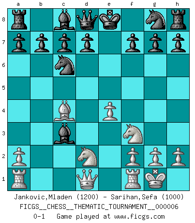 Last move : 0-1 2006 September 19 17:6:52 [Event "FICGS__CHESS__THEMATIC_TOURNAMENT__000006"] [Site "FICGS"] [Date "2006.07.23"] [Round "1"] [White "Jankovic,Mladen"] [Black "Sarihan,Sefa"] [Result "0-1"] [WhiteElo "1200"] [BlackElo "1000"] 1.e4 e5 2.Nf3 Nc6 3.d4 exd4 4.Bc4 Bb4+ 5.c3 dxc3 6.bxc3 Be7 7.Bg5 Bxg5 8.O-O Bf6 9.Nbd2 Bxc3 0-1 Scotch gambit Kingside Castling by player White (move 8) Player Black won this chess game. Follow this game move after move (download)Chess is ruthless: you've got to be prepared to kill people. (Nigel Short) Wer der Ansicht ist, daß alle Schachspieler verrückt sind, wird durch Studium des Lebens von Emil Josef Diemer nicht auf andere Gedanken kommen. (Hans Ree) En la vida, como en el Ajedrez, los Peones propios obstruyen nuestro camino. La gran fortuna de un hombre, su comodidad, placer, hijos, libros, que deberían ayudarle a ganar, con mucha frecuencia lo ponen en Jaque Mate. (Charles Buxton) Les échecs sont un jeu terrible. Si vous n'avez pas le centre, votre adversaire a une position plus libre. Par contre, si vous avez le centre, alors vous avez vraiment quelque chose pour laquelle vous inquiéter ! (Siegbert Tarrasch) The age of a woman doesn't mean a thing. The best tunes are played on the oldest fiddles. (Ralph Waldo Emerson)