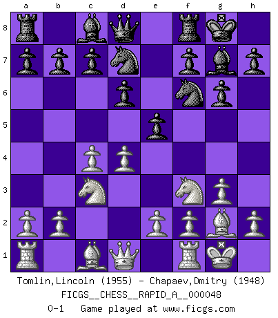 Last move : 0-1 2008 July 20 21:5:42 [Event "FICGS__CHESS__RAPID_A__000048"] [Site "FICGS"] [Date "2008.07.01"] [Round "1"] [White "Tomlin,Lincoln"] [Black "Chapaev,Dmitry"] [Result "0-1"] [WhiteElo "1955"] [BlackElo "1948"] 1.c4 e5 2.g3 g6 3.Bg2 Bg7 4.Nc3 d6 5.Nf3 Nf6 6.d4 Nbd7 7.O-O O-O 0-1 English Opening Kingside Castling by player White (move 7) Kingside Castling by player Black (move 7) Player Black won this chess game. Follow this game move after move (download)For me, Chess is life and every game is like a new life. Every Chess player gets to live many lives in one lifetime. (Eduard Gufeld) Ohne Leiden bildet sich kein Charakter. (Ernst Freiherr von Feuchtersleben) Yo siempre he tenido un ligero sentimiento de lástima por una persona que no tiene conocimiento del Ajedrez. (Siegbert Tarrasch) Aux échecs, les retours au sommet sont rares : les dommages psychologiques consécutifs à une défaite sont trop sévères. (Daily Telegraph) The leaves of memory seemed to make a mournful rustling in the dark. (Henry Wadsworth Longfellow)