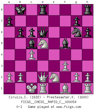 Last move : 0-1 2008 July 8 23:48:56 [Event "FICGS__CHESS__RAPID_C__000054"] [Site "FICGS"] [Date "2008.07.02"] [Round "1"] [White "Cirulis,Ilmars"] [Black "Prestesaeter,Kjetil"] [Result "0-1"] [WhiteElo "1632"] [BlackElo "1600"] 1.d4 f5 2.c4 Nf6 3.f3 Nc6 4.Nc3 e6 5.d5 Ne5 6.Qd4 Ng6 7.dxe6 b6 8.exd7+ Bxd7 9.Bg5 Bc5 10.Qd2 h6 11.Bxf6 Qxf6 12.Nd5 Qd6 13.O-O-O O-O-O 14.e4 Kb8 15.exf5 Bxf5 16.Ne2 c6 0-1 Dutch defense Queenside Castling by player White (move 13) Queenside Castling by player Black (move 13) Player Black won this chess game. Follow this game move after move (download)Why must I lose to this idiot ? (Aron Nimzovich) Man wirke der falschen Auffassung entgegen, als ob jeder Zug Unmittelbares zu leisten habe; auch Werte- und Ruhezüge haben ihre Existenzberechtigung. (Aaron Nimzowitsch) No puedes jugar al Ajedrez si eres de corazón noble. (Proverbio Francés) Il (Jacob Murray) ne joue pas pour le bon coup, mais pour le meilleur. (Eloi Relange) What doesn't kill us makes us stronger. (Friedrich Nietzsche)