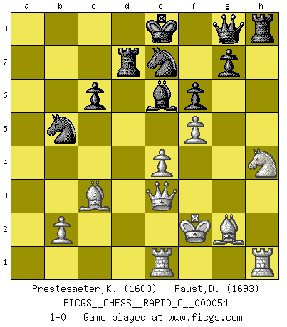 Last move : 1-0 2008 August 15 10:55:14 [Event "FICGS__CHESS__RAPID_C__000054"] [Site "FICGS"] [Date "2008.07.02"] [Round "1"] [White "Prestesaeter,Kjetil"] [Black "Faust,Dieter"] [Result "1-0"] [WhiteElo "1600"] [BlackElo "1693"] 1.g4 d5 2.Bg2 e5 3.c4 dxc4 4.Nc3 Bd6 5.Qa4+ c6 6.Qxc4 Be6 7.Qd3 Ne7 8.Ne4 Bd5 9.Nxd6+ Qxd6 10.e4 Qg6 11.Qe3 Be6 12.Nf3 Nd7 13.h3 h5 14.Nh4 Qh7 15.d4 hxg4 16.hxg4 Qg8 17.Bd2 exd4 18.Qxd4 Bxg4 19.f3 Be6 20.O-O-O f6 21.Qb4 Bxa2 22.Qxb7 Rb8 23.Qc7 Rc8 24.Qd6 Nb6 25.Bc3 Bb3 26.Rde1 Rd8 27.Qa3 Be6 28.Qxa7 Nbc8 29.Qe3 Rd7 30.f4 Ra7 31.Kd2 Rd7+ 32.Ke2 Nd6 33.Kf2 Nb5 34.f5 1-0 Grob's attack Queenside Castling by player White (move 20) Player White won this chess game. Follow this game move after move (download)Chess is a cold bath for the mind. (Sir John Simon) Kleine Schachspieler machen Mist, und große Schachspieler machen Mist, aber große machen weniger Mist. (Fritz Sämisch) La maestría del Ajedrez consiste esencialmente en analizar posiciónes de Ajedrez con precisión. (Mikhail Botvinnik) Même si l'adversaire joue le coup analysé précédemment, recommencez l'analyse en voyant la nouvelle position. Première règle de Blumenfeld All maxims have their antagonist maxims; proverbs should be sold in pairs, a single one being but a half truth. (William Mathews)