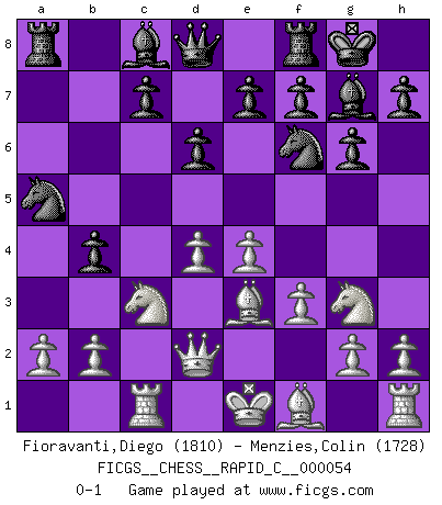 Last move : 0-1 2008 September 24 18:41:30 [Event "FICGS__CHESS__RAPID_C__000054"] [Site "FICGS"] [Date "2008.07.02"] [Round "1"] [White "Fioravanti,Diego"] [Black "Menzies,Colin"] [Result "0-1"] [WhiteElo "1810"] [BlackElo "1728"] 1.d4 Nf6 2.c4 g6 3.Nc3 Bg7 4.e4 d6 5.f3 O-O 6.Be3 Nc6 7.Nge2 a6 8.Qd2 Na5 9.Ng3 b5 10.cxb5 axb5 11.Rc1 b4 0-1 King's Indian : Saemisch, Panno formation Kingside Castling by player Black (move 5) Player Black won this chess game. Follow this game move after move (download)Play the opening like a book, the middle game like a magician, and the endgame like a machine. (Spielmann) Alle Schachspieler sollten auch ein Hobby haben. (Savielly Grigorievitsch Tartakower) No hay precio que sea tan grande por la cabellera del Rey enemigo. (Koblentz) Si je n'étais pas joueur d'échecs, je serais le meilleur dans quelque chose d'autre. (Anatoli Karpov) Good luck. You're gonna need it. (Han Solo in Star Wars ep.6)