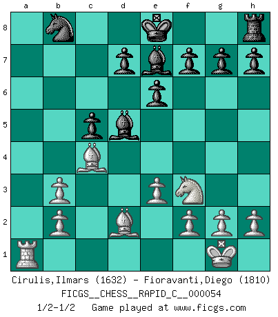 Last move : 1/2-1/2 2008 September 8 7:44:41 [Event "FICGS__CHESS__RAPID_C__000054"] [Site "FICGS"] [Date "2008.07.02"] [Round "1"] [White "Cirulis,Ilmars"] [Black "Fioravanti,Diego"] [Result "1/2-1/2"] [WhiteElo "1632"] [BlackElo "1810"] 1.d4 Nf6 2.c4 c5 3.d5 b5 4.cxb5 a6 5.e3 axb5 6.Bxb5 Qa5+ 7.Nc3 Bb7 8.Bd2 Qb6 9.Nf3 Nxd5 10.Qb3 e6 11.O-O Be7 12.Nxd5 Bxd5 13.Bc4 Qxb3 14.axb3 Rxa1 15.Rxa1 1/2-1/2 Benko gambit half accepted Kingside Castling by player White (move 11) This chess game ended in a draw. Follow this game move after move (download)The game of chess is the touchstone of the intellect. (Goethe) Obwohl ich alt bin, darf mir niemand den Finger in den Mund stecken, sonst beisse ich. (Wilhelm Steinitz) Yo tuve un dolor de muelas en la primer partida. En el segundo juego, tuve un dolor de cabeza. En el tercero, tuve un ataque de reumatísmo. En la cuarta partida, no me sentía muy bien. ¿Y en el quinto juego? Bueno, ¿que acaso uno tiene que ganar todos los juegos?. (Siegbert Tarrasch) Tous ces prétendus hommes politiques sont les pions, les Cavaliers, les Tours ou les Fous d'une partie d'échecs qui se jouera tant qu'un hasard ne renversera pas l'échiquier. (Honoré de Balzac) He who defends everything defends nothing. (Frederick the Great)