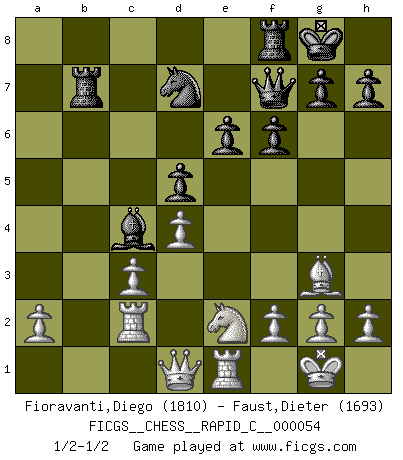 Last move : 1/2-1/2 2008 September 9 11:40:45 [Event "FICGS__CHESS__RAPID_C__000054"] [Site "FICGS"] [Date "2008.07.02"] [Round "1"] [White "Fioravanti,Diego"] [Black "Faust,Dieter"] [Result "1/2-1/2"] [WhiteElo "1810"] [BlackElo "1693"] 1.c4 c6 2.e4 d5 3.exd5 cxd5 4.d4 Nf6 5.Nc3 e6 6.Bg5 Be7 7.Rc1 Nc6 8.Nf3 O-O 9.c5 b6 10.Bb5 Qc7 11.Bxc6 Qxc6 12.Ne5 Qe8 13.cxb6 Ba6 14.bxa7 Nd7 15.Bf4 Rxa7 16.Nd3 f6 17.Bg3 Qg6 18.Nf4 Qf7 19.Nfe2 Rb7 20.Rc2 Bb4 21.O-O Bxc3 22.bxc3 Bc4 23.Re1 1/2-1/2 English : Caro-Kann defensive system Kingside Castling by player Black (move 8) Kingside Castling by player White (move 21) This chess game ended in a draw. Follow this game move after move (download)I look one move ahead... the best ! (Siegbert Tarrasch) Ich möchte Schüler heranbilden, die das Vermögen haben, selbst zu denken und Kritik zu üben. (Emanuel Lasker) Un entendimiento a fondo de las continuaciones típicas del mate, hace de las combinaciones de sacrificio mas complicadas conducirlas a ellas no solo sin dificultad, sino casi de una manera natural. (Siegbert Tarrasch) Aidez vos pièces, elles vous aideront. (Paul Morphy) Convictions are more dangerous enemies of truth than lies. (Friedrich Nietzsche)