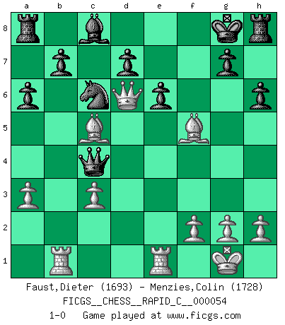 Last move : 1-0 2008 July 22 19:6:19 [Event "FICGS__CHESS__RAPID_C__000054"] [Site "FICGS"] [Date "2008.07.02"] [Round "1"] [White "Faust,Dieter"] [Black "Menzies,Colin"] [Result "1-0"] [WhiteElo "1693"] [BlackElo "1728"] 1.e4 c5 2.Nf3 e6 3.d4 cxd4 4.Nxd4 Nc6 5.c4 Qh4 6.Nc3 Bb4 7.Ndb5 Qxe4+ 8.Be2 Qe5 9.a3 Bxc3+ 10.bxc3 Kf8 11.O-O Nf6 12.Re1 Ne8 13.Rb1 a6 14.Bf3 Qc5 15.Be3 Qxc4 16.Nd6 Nxd6 17.Qxd6+ Kg8 18.Bc5 h6 19.Be4 f5 20.Bxf5 1-0 Sicilian defense Kingside Castling by player White (move 11) Player White won this chess game. Follow this game move after move (download)Chess is really ninety nine percent calculation. (Soltis) Im Schach gibt es keinen Platz für Galanterie. (Irving Chernev) Alekhine es un poeta que crea un trabajo de arte de algo que raramente inspiraría a otra persona a mandar una tarjeta postal. (Max Euwe) Il s'avisa de me proposer d'apprendre les échecs qu'il jouait un peu... me voilà forcené des échecs. J'achète un échiquier, je m'enferme dans ma chambre, j'y passe des jours et des nuits à vouloir apprendre par cur toutes les parties. (Jean-Jacques Rousseau, Confessions) Who needs drugs and alcohol if he can play Big Chess at FICGS ? (Heinz-Georg Lehnhoff)