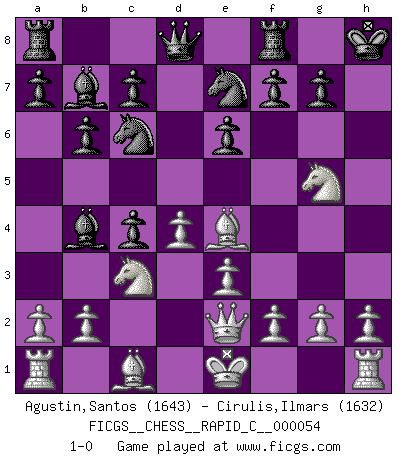 Last move : 1-0 2008 July 7 11:21:55 [Event "FICGS__CHESS__RAPID_C__000054"] [Site "FICGS"] [Date "2008.07.02"] [Round "1"] [White "Agustin,Santos"] [Black "Cirulis,Ilmars"] [Result "1-0"] [WhiteElo "1643"] [BlackElo "1632"] 1.d4 d5 2.c4 e6 3.Nf3 Bb4+ 4.Nc3 Ne7 5.e3 O-O 6.Bd3 b6 7.Qc2 dxc4 8.Bxh7+ Kh8 9.Be4 Nbc6 10.Qe2 Bb7 11.Ng5 1-0 Queen's gambit declined Kingside Castling by player Black (move 5) Player White won this chess game. Follow this game move after move (download)If your opponent cannot do anything active, then don't rush the position; instead you should let him sit there, suffer, and beg you for a draw. (Jeremy Silman) Mein Gehirn das ist mein zweitwichtigstes Organ [Aus dem Film: Der Schläfer]. (Woody Allen) Si tu oponente no puede hacer nada activo, entonces no apures la posición; En vez de eso, dejalo estar sentado ahí, sufriendo y rogandote por un empate. (Jeremy Silman) La tactique, c'est ce que vous faites quand il y a quelque chose à faire; la stratégie, c'est ce que vous faites quand il n'y a rien à faire. (Savielli Tartacower) The smarter you play, the luckier you'll be. (Mark Pilarski)