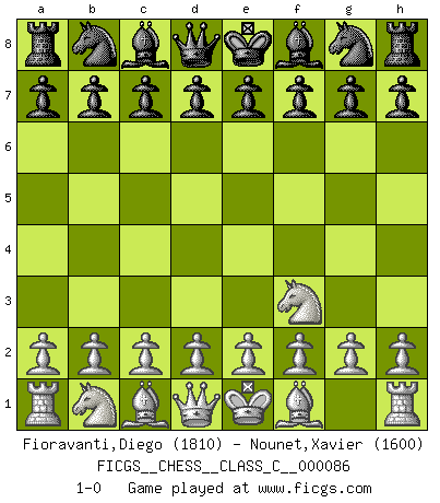 Last move : 1-0 2008 September 18 22:2:15 [Event "FICGS__CHESS__CLASS_C__000086"] [Site "FICGS"] [Date "2008.07.02"] [Round "1"] [White "Fioravanti,Diego"] [Black "Nounet,Xavier"] [Result "1-0"] [WhiteElo "1810"] [BlackElo "1600"] 1.Nf3 1-0 This chess game has been lost on time (started : 2008.07.02 18:27:28) Reti Opening Player White won this chess game. Follow this game move after move (download)The way he plays Chess demonstrates a man's whole nature. (Stanley Ellin) In der Schule lernt man nichts. Es ist nur Zeitverschwendung. (Robert James Fischer) Algunos sacrificios son sólidos, los demás son míos. (Mikhail Tal) Toutes choses étant égales, c'est la conviction qui gagne. Alliée à une volonté de vaincre, elle sert de détonateur, suscite des idées, disperse les doutes et aide à penser clairement. (Robert Fischer) There is a great deal of difference between an eager man who wants to read a book and a tired man who wants a book to read. (G.K. Chesterton)