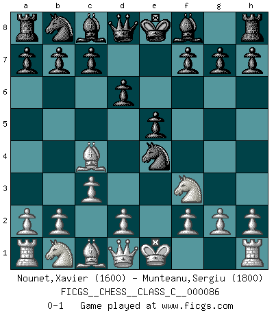 Last move : 0-1 2008 August 15 18:7:11 [Event "FICGS__CHESS__CLASS_C__000086"] [Site "FICGS"] [Date "2008.07.02"] [Round "1"] [White "Nounet,Xavier"] [Black "Munteanu,Sergiu"] [Result "0-1"] [WhiteElo "1600"] [BlackElo "1800"] 1.e4 e5 2.Nf3 d6 3.Bc4 Nf6 4.c3 Nxe4 0-1 This chess game has been lost on time (started : 2008.07.02 18:27:28) Philidor's defense Player Black won this chess game. Follow this game move after move (download)The game of Chess is not merely an idle amusement; several very valuable qualities of the mind are to be acquired and strengthened by it, so as to become habits ready on all occasions; for life is a kind of Chess. (Benjamin Franklin) Schach ist ein Kampf gegen den Fehler. (Johannes Herrman Zukertort) Dios mío, Bobby Fischer juega tan simple. (Alexei Suetin) Je ne crois pas en la psychologie, je crois aux bons coups. (Robert Fischer) First of all, we have to go back to the classical time control. (Anatoly Karpov)