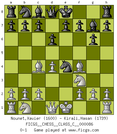 Last move : 0-1 2008 August 13 5:57:38 [Event "FICGS__CHESS__CLASS_C__000086"] [Site "FICGS"] [Date "2008.07.02"] [Round "1"] [White "Nounet,Xavier"] [Black "Kirali,Hasan"] [Result "0-1"] [WhiteElo "1600"] [BlackElo "1739"] 1.e4 d6 2.d4 g6 3.Nf3 Bg7 4.Bc4 Nf6 5.Bf4 Nxe4 0-1 This chess game has been lost on time (started : 2008.07.02 18:27:28) King's pawn Opening Player Black won this chess game. Follow this game move after move (download)Who is your opponent tonight, tonight I am playing against the Black pieces. (Akiba Rubinstein) Bogoljubow: Matt in vier Zügen! Tartakower: Ich verbitte mir jede Belästigung! (Savielly Grigorievitsch Tartakower) La caracteristica mas importante en la posición del Ajedrez es la actividad de las piezas. Esto es absolutamente fundamental en todas las fases del juego: Apertura, Juego Medio y especialmente Finales. La limitación primordial en la actividad de una pieza, es la estructuración de los Peones. (Michael Stean) On croit qu'il y a plus de mauvais joueurs que de bons joueurs, c'est faux : Il y a autant de joueurs qui gagnent que de joueurs qui perdent. (Philippe Geluck) Philosophers use a language that is already deformed as though by shoes that are too tight. (Ludwig Wittgenstein)