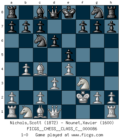 Last move : 1-0 2008 August 12 17:48:9 [Event "FICGS__CHESS__CLASS_C__000086"] [Site "FICGS"] [Date "2008.07.02"] [Round "1"] [White "Nichols,Scott"] [Black "Nounet,Xavier"] [Result "1-0"] [WhiteElo "1872"] [BlackElo "1600"] 1.e4 e5 2.Nf3 Nc6 3.Bc4 Bc5 4.b4 Bxf2+ 5.Kxf2 d6 6.d3 1-0 This chess game has been lost on time (started : 2008.07.02 18:27:28) Evans gambit declined Player White won this chess game. Follow this game move after move (download)If your opponent offers you a draw, try to work out why he thinks he's worse off. (Nigel Short) Als er Schachweltmeister wurde ließ er praktisch alle stärksten Sovietspieler für sich arbeiten. Wenn ein auch nur mittelmässiger Meister ein Spezialist für eine bestimmte Eröffnung war, wurde er von Karpov gerufen. Das wurde alles geheim gehalten. (Mikhail Moiseyevich Botvinik) Me siento como si fuera una pieza en una partida de Ajedrez, cuando mi oponente me indica: esa pieza no puede ser movida. (Soren Kierkegaard) J'ai vu le vaincu d'Echecs jouer des années durant dans l'espoir de la fête de la victoire. Car tu es plus riche de ce qu'elle existe si même elle n'est point pour toi. Ainsi de la perle du fond des mers. (Antoine de Saint-Exupéry) I don't diet. I just don't eat as much as I'd like to. (Linda Evangelista, supermodel)