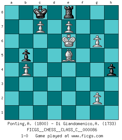 Last move : 1-0 2008 September 2 14:36:25 [Event "FICGS__CHESS__CLASS_C__000086"] [Site "FICGS"] [Date "2008.07.02"] [Round "1"] [White "Ponting,Andrew"] [Black "Di Giandomenico,Alfonso"] [Result "1-0"] [WhiteElo "1800"] [BlackElo "1733"] 1.d4 Nf6 2.c4 e6 3.Nc3 Bb4 4.Bg5 c5 5.d5 exd5 6.cxd5 d6 7.e3 Nbd7 8.Bb5 O-O 9.Nge2 Qa5 10.Bxd7 Nxd7 11.Be7 Re8 12.Bxd6 Nf6 13.Bf4 Bf5 14.a3 Bxc3+ 15.Nxc3 Ne4 16.Rc1 Nxc3 17.Rxc3 Qb5 18.Qd2 Rad8 19.f3 c4 20.d6 Bd3 21.h4 Qf5 22.Kf2 b5 23.e4 Qc5+ 24.Qe3 Qxe3+ 25.Kxe3 f5 26.Rxd3 cxd3 27.Kxd3 fxe4+ 28.fxe4 Kf7 29.Kd4 Ke6 30.Rc1 Rc8 31.Rc7 Rxc7 32.dxc7 Kd7 33.Kd5 a5 34.Bd6 Rg8 35.e5 h5 36.e6+ Kc8 37.Bf4 Re8 38.Kd6 g6 39.b4 axb4 40.axb4 Rg8 41.e7 g5 42.hxg5 h4 43.Ke6 Rh8 44.Be5 Re8 45.g6 1-0 Nimzo-Indian : Leningrad variation Kingside Castling by player Black (move 8) Player White won this chess game. Follow this game move after move (download)A man that will take back a move at Chess will pick a pocket. (Richard Fenton) Man braucht nicht immer den besten Zug zu spielen: Ein Zug muß aktiv, unternehmungslustig, korrekt und schön sein. (David Bronstein) Robert Fischer es la ley hacia si mismo. (Larry Evans) Aux échecs, l'amour-propre est satisfait quand on remporte la victoire, mais il n'y a pas de honte à être battu. (Benjamin Franklin) If we don't succeed, we run the risk of failure. (George W. Bush)