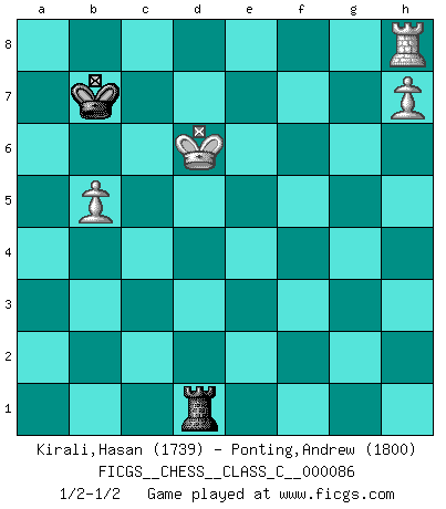 Last move : 1/2-1/2 2008 August 19 9:57:41 [Event "FICGS__CHESS__CLASS_C__000086"] [Site "FICGS"] [Date "2008.07.02"] [Round "1"] [White "Kirali,Hasan"] [Black "Ponting,Andrew"] [Result "1/2-1/2"] [WhiteElo "1739"] [BlackElo "1800"] 1.e4 c5 2.Nf3 Nc6 3.d4 cxd4 4.Nxd4 Nf6 5.Nc3 e5 6.Ndb5 a6 7.Nd6+ Bxd6 8.Qxd6 Qe7 9.Qxe7+ Nxe7 10.Bg5 O-O 11.O-O-O b5 12.Rd6 Rd8 13.Be2 Bb7 14.Rhd1 Bc6 15.a3 Kf8 16.Bxf6 gxf6 17.Bg4 Ra7 18.Rxf6 Kg7 19.Rf3 a5 20.Bh5 Rf8 21.Rg3+ Kh8 22.Be2 Rb8 23.b4 axb4 24.axb4 Ra1+ 25.Kb2 Rxd1 26.Bxd1 f5 27.exf5 Nxf5 28.Rg5 Nd6 29.Be2 Nf7 30.Rf5 Kg7 31.f4 Bxg2 32.Bh5 Nd6 33.Rg5+ Kh6 34.Be2 Bc6 35.Rxe5 Kg7 36.Kb3 h6 37.Bd3 Rf8 38.Ne2 Rf7 39.Ng3 Rf8 40.Nf5+ Nxf5 41.Rxf5 Rb8 42.c4 d6 43.cxb5 Bd7 44.Rh5 Be8 45.Rh3 Bxb5 46.Bxb5 Rxb5 47.Kc4 Rf5 48.Rh4 Kf7 49.b5 Ke7 50.Rxh6 Rxf4+ 51.Kc3 Rf7 52.h4 Kd7 53.h5 Kc7 54.Rh8 Rf3+ 55.Kd4 Rf4+ 56.Ke3 Rh4 57.h6 Kb6 58.Kf3 Kb7 59.Kg3 Rh5 60.Kg4 Rh1 61.Kf5 Kc7 62.h7 Kb7 63.Ke6 Ka7 64.Kd5 Kb7 65.Kxd6 Rd1+ 1/2-1/2 Sicilian : Pelikan (Lasker/Sveshnikov) variation Kingside Castling by player Black (move 10) Queenside Castling by player White (move 11) 10 pieces endgame at move 46 : White KRBPPP , Black KRPP WHITE : King + 1 Rook 1 Bishop 3 Pawns BLACK : King + 1 Rook 2 Pawns 9 pieces endgame at move 46 : White KRPPP , Black KRPP WHITE : King + 1 Rook 3 Pawns BLACK : King + 1 Rook 2 Pawns 8 pieces endgame at move 50 : White KRPPP , Black KRP WHITE : King + 1 Rook 3 Pawns BLACK : King + 1 Rook 1 Pawn 7 pieces endgame at move 50 : White KRPP , Black KRP WHITE : King + 1 Rook 2 Pawns BLACK : King + 1 Rook 1 Pawn 6 pieces endgame at move 65 : White KRPP , Black KR WHITE : King + 1 Rook 2 Pawns BLACK : King + 1 Rook This chess game ended in a draw. Follow this game move after move (download)Chess is a terrible game. If you have no center, your opponent has a freer position. If you do have a center, then you really have something to worry about ! (Siegbert Tarrasch) Drei Punkte vor allen anderen ist wie einer, der im weißen Anzug posiert, während der Rest in Müllsäcke gekleidet dasteht. (Viktor Kortschnoi) ¿Se han dado cuenta de que Fischer casi nunca ha tenido piezas malas? El las intercambia y las piezas malas se quedan con sus oponenets. (Yuri Balashov) Il n'y a pas eu de défaite parce que je ne crois pas que cet ordinateur ait jamais existé. IBM a triché en refusant d'imprimer les modes de recherche de la machine. C'est évident, pendant le match, des coups décisifs ont été joués par des êtres humains. Aujourd'hui, les meilleurs spécialistes en informatique ne peuvent toujours pas expliquer comment Deep-Blue a pu jouer contre la logique des ordinateurs. IBM a gagné une guerre de communication, mais ils sont incapables de prouver que l'ordinateur a gagné tout seul. (Garry Kasparov) It is the aim of the modern school, not to treat every position according to one general law, but according to the principle inherent in the position. (Richard Reti)