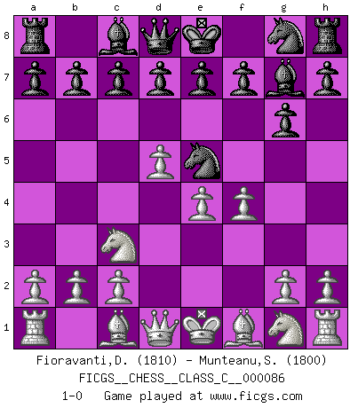 Last move : 1-0 2008 October 8 11:0:36 [Event "FICGS__CHESS__CLASS_C__000086"] [Site "FICGS"] [Date "2008.07.02"] [Round "1"] [White "Fioravanti,Diego"] [Black "Munteanu,Sergiu"] [Result "1-0"] [WhiteElo "1810"] [BlackElo "1800"] 1.Nc3 g6 2.d4 Bg7 3.e4 Nc6 4.d5 Ne5 5.f4 1-0 This chess game has been lost on time (started : 2008.07.02 18:27:28) Dunst (Sleipner, Heinrichsen) Opening Player White won this chess game. Follow this game move after move (download)Chess is a part of culture and if a culture is declining then Chess too will decline. (Mikhail Botvinnik) Das Schachspiel hat wie die Liebe, die Musik, die Fähigkeit, den Menschen glücklich zu machen. Ich habe ein leises Gefühl des Bedauerns für jeden, der das Schachspiel nicht kennt, so wie ich jeden bedaure, der die Liebe nicht kennt. (Siegbert Tarrasch) ¿Quién es tu oponente esta tarde? Esta tarde mi oponente son las piezas negras. (Akiba Rubinstein) L'attaque fait le spectacle, la défense gagne les matchs. (Dicton footballistique) Any activity becomes creative when the doer cares about doing it right or doing it better. (John Updike)