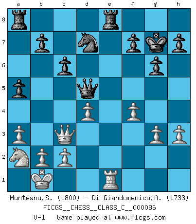 Last move : 0-1 2008 October 24 0:36:30 [Event "FICGS__CHESS__CLASS_C__000086"] [Site "FICGS"] [Date "2008.07.02"] [Round "1"] [White "Munteanu,Sergiu"] [Black "Di Giandomenico,Alfonso"] [Result "0-1"] [WhiteElo "1800"] [BlackElo "1733"] 1.g3 Nf6 2.Bg2 e5 3.Nc3 Bc5 4.e3 c6 5.Nf3 d6 6.d4 exd4 7.exd4 Bb4 8.Bd2 d5 9.a3 Ba5 10.Qe2+ Kf8 11.O-O-O Bg4 12.h3 Bxf3 13.Bxf3 Nbd7 14.Na2 Bxd2+ 15.Rxd2 g6 16.Re1 Kg7 17.Qe7 Qa5 18.Qb4 Qc7 19.Rde2 a5 20.Qc3 Qd6 21.Re7 Ne4 22.Bxe4 Qxe7 23.Bxd5 Qg5+ 24.f4 Qxd5 25.Kb1 Rhe8 0-1 Benko's Opening Queenside Castling by player White (move 11) Player Black won this chess game. Follow this game move after move (download)It's just you and your opponent at the board and you're trying to prove something. (Bobby Fischer) Alles was ich jemals tun will ist Schach spielen. (Robert James Fischer) Bobby es la celebridad menos entendida y malinterpretada que camina el la faz de esta tierra. (Yasser Seirawan) Le moment que je préfère le plus dans une rencontre, c'est celui où je sens que la personnalité de l'adversaire se brise. (Robert Fischer) Knowledge will give you power, but character respect. (Bruce Lee)