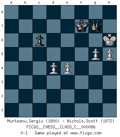 Last move : 0-1 2008 August 8 6:56:33 [Event "FICGS__CHESS__CLASS_C__000086"] [Site "FICGS"] [Date "2008.07.02"] [Round "1"] [White "Munteanu,Sergiu"] [Black "Nichols,Scott"] [Result "0-1"] [WhiteElo "1800"] [BlackElo "1872"] 1.g3 d6 2.Bg2 c6 3.Nf3 Nf6 4.d3 e5 5.Nc3 Be7 6.Bg5 O-O 7.O-O h6 8.Bxf6 Bxf6 9.Ne4 Be7 10.d4 d5 11.Nc3 e4 12.Ne5 Bd6 13.f4 Qe8 14.Nxe4 dxe4 15.Bxe4 Bxe5 16.dxe5 Bh3 17.Bg2 Bxg2 18.Kxg2 Na6 19.Qd3 Qe6 20.Qd6 Qxd6 21.exd6 Rfe8 22.Kf3 Rad8 23.Rad1 Re6 24.Rd3 Rexd6 25.Rfd1 Rxd3+ 26.Rxd3 Rxd3+ 27.cxd3 Kf8 28.Ke4 Ke7 29.Kf5 Nc5 30.b3 Kd6 31.g4 a5 32.g5 hxg5 33.fxg5 Nxb3 34.axb3 g6+ 35.Kf6 b5 36.h4 a4 37.bxa4 bxa4 38.Kxf7 a3 39.Kxg6 a2 40.h5 a1Q 41.Kh7 Qe5 42.Kh6 Ke6 43.Kg6 Qf5+ 44.Kh6 Kf7 45.e4 Qe5 46.d4 Qg7+ 0-1 Benko's Opening Kingside Castling by player Black (move 6) Kingside Castling by player White (move 7) 10 pieces endgame at move 37 : White KPPPP , Black KPPPP WHITE : King + 4 Pawns BLACK : King + 4 Pawns 9 pieces endgame at move 38 : White KPPPP , Black KPPP WHITE : King + 4 Pawns BLACK : King + 3 Pawns 8 pieces endgame at move 39 : White KPPPP , Black KPP WHITE : King + 4 Pawns BLACK : King + 2 Pawns Promotion Queen by player Black (move 40) Player Black won this chess game. Follow this game move after move (download)A bad plan is better than none at all. (Frank Marshall) Sie führen leise Selbstgespräche, schlürfen lautstark ihre Getränke, schmatzen hörbar beim Essen, blasen ihrem Gegenüber Rauch in die Augen, niesen ihm ins Gesicht, starren ihn unverwandt an, bis er sich unter ihren Blicken windet, rutschen ständig auf ihrem Stuhl hin und her, rülpsen und bohren in der Nase. (Anonymous) El Jaque al descubierto es el bombardero del tablero. (Reuben Fine) Les Echecs sont affaire de jugement sensible. Savoir quand frapper et quand esquiver. (Fischer) 'preceded by its own quotation yields a falsehood' preceded by its own quotation yields a falsehood. (W. V. O. Quine - Set Theory And Its Logic, 1953)