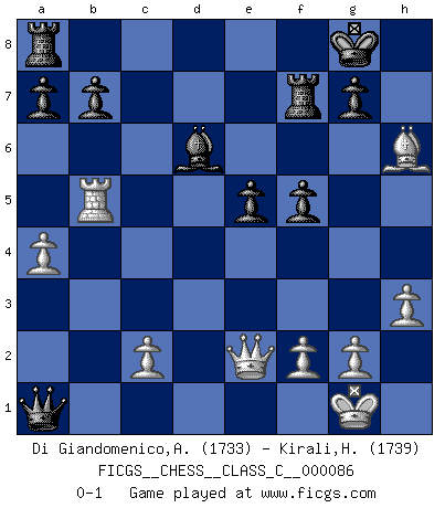 Last move : 0-1 2008 August 18 16:0:32 [Event "FICGS__CHESS__CLASS_C__000086"] [Site "FICGS"] [Date "2008.07.02"] [Round "1"] [White "Di Giandomenico,Alfonso"] [Black "Kirali,Hasan"] [Result "0-1"] [WhiteElo "1733"] [BlackElo "1739"] 1.e4 c5 2.Nf3 Nc6 3.d4 cxd4 4.Nxd4 Nf6 5.Nc3 e5 6.Nf3 Bb4 7.Bd3 d5 8.exd5 Nxd5 9.Bd2 Nxc3 10.bxc3 Bd6 11.h3 h6 12.O-O O-O 13.Qe2 Be6 14.a4 Qe7 15.Rfb1 f5 16.Bc4 Rf7 17.Bxe6 Qxe6 18.Nd4 Qd5 19.Rb5 Nxd4 20.cxd4 Qxd4 21.Bxh6 Qxa1+ 0-1 Sicilian : Pelikan (Lasker/Sveshnikov) variation Kingside Castling by player White (move 12) Kingside Castling by player Black (move 12) Player Black won this chess game. Follow this game move after move (download)One bad move nullifies forty good ones. (Horowitz) Wenn du nicht weißt was du tun sollst, warte bis dein Gegner eine Idee hat. Sie wird sicher schlecht sein. (Siegbert Tarrasch) La esencia del Ajedrez es pensar acerca de lo que el Ajedrez es. (David Bronstein) La tactique, c'est ce que vous faites quand il y a quelque chose à faire; la stratégie, c'est ce que vous faites quand il n'y a rien à faire. (Savielli Tartacower) I don't believe in psychology. I believe in good moves. (Bobby Fischer)