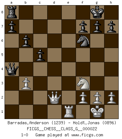 Last move : 1-0 2008 December 8 13:55:42 [Event "FICGS__CHESS__CLASS_G__000022"] [Site "FICGS"] [Date "2008.07.02"] [Round "1"] [White "Barradas,Anderson"] [Black "Holdt,Jonas"] [Result "1-0"] [WhiteElo "1239"] [BlackElo "0896"] 1.e4 e5 2.Nf3 Nc6 3.Bc4 Nf6 4.O-O Bc5 5.b4 Bxb4 6.Ba3 Bxa3 7.Nxa3 Nxe4 8.d3 Nf6 9.Re1 d6 10.Bb5 Bd7 11.Bxc6 Bxc6 12.Nc4 O-O 13.d4 exd4 14.Nxd4 Qd7 15.Na5 Bd5 16.c4 Be4 17.Rc1 b6 18.Nab3 c5 19.Nf3 Qa4 20.Qe2 Rfe8 21.Qd2 d5 22.cxd5 Bxd5 23.Rb1 Rxe1+ 24.Rxe1 Bxb3 25.axb3 1-0 This chess game has been lost on time (started : 2008.07.02 22:12:16) Two knights defense Kingside Castling by player White (move 4) Kingside Castling by player Black (move 12) Player White won this chess game. Follow this game move after move (download)Pawn endings are to Chess what putting is to golf. (Cecil Purdy) Über Frauen: Chess is better. (Robert James Fischer) Un entendimiento minucioso de las típicas continuaciones de mate hacen de las mas complicadas combinaciones de sacrificio que conducen hacia ellas no solo no dificiles, sino casi un asunto de rutina. (Siegbert Tarrasch) Il (Jacob Murray) ne joue pas pour le bon coup, mais pour le meilleur. (Eloi Relange) Being number two sucks. (Andre Agassi)