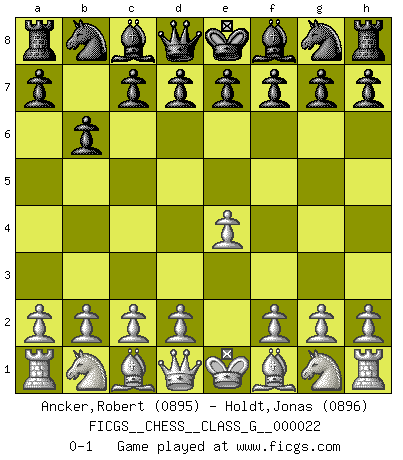 Last move : 0-1 2008 August 13 5:57:38 [Event "FICGS__CHESS__CLASS_G__000022"] [Site "FICGS"] [Date "2008.07.02"] [Round "1"] [White "Ancker,Robert"] [Black "Holdt,Jonas"] [Result "0-1"] [WhiteElo "0895"] [BlackElo "0896"] 1.e4 b6 0-1 This chess game has been lost on time (started : 2008.07.02 22:12:16) Owen defense Player Black won this chess game. Follow this game move after move (download)I guess a certain amount of temperament is expected of Chess geniuses. (Ron Gross) Schach verlangt totale Konzentration. (Robert James Fischer) Siempre es mejor sacrificar los hombres de tu oponente. (Savielly Tartakower) La vérité est comme le meilleur coup aux échecs : elle existe, mais il faut la chercher. (Arturo Perez-Reverte) The general who wins the battle makes many calculations in his temple before the battle is fought. The general who loses makes but few calculations beforehand. (Sun Tzu)