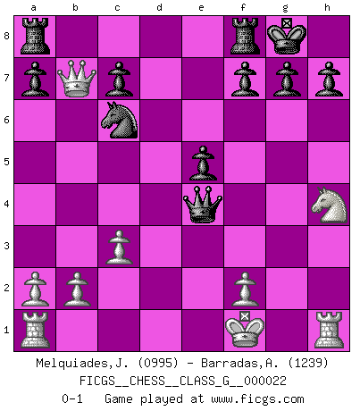 Last move : 0-1 2008 October 21 0:23:6 [Event "FICGS__CHESS__CLASS_G__000022"] [Site "FICGS"] [Date "2008.07.02"] [Round "1"] [White "Melquiades,Jay"] [Black "Barradas,Anderson"] [Result "0-1"] [WhiteElo "0995"] [BlackElo "1239"] 1.e4 e5 2.Nf3 Nc6 3.c3 Nf6 4.d3 Bd6 5.Bg5 O-O 6.Be2 Be7 7.h4 d6 8.Nbd2 Nh5 9.Bxe7 Qxe7 10.Ng5 Nf4 11.d4 Nxg2+ 12.Kf1 Nxh4 13.Ndf3 Nxf3 14.Nxf3 Qf6 15.dxe5 dxe5 16.Nh4 Qf4 17.Qb3 Bg4 18.Bxg4 Qxg4 19.Qxb7 Qxe4 0-1 Ponziani : Jaenisch counter-attack Kingside Castling by player Black (move 5) Player Black won this chess game. Follow this game move after move (download)After a bad opening, there is hope for the middle game. After a bad middle game, there is hope for the endgame. But once you are in the endgame, the moment of truth has arrived. (Edmar Mednis) Schach sollte überall auf der Welt Schulfach werden. Es fördert die geistige Auseinandersetzung. Es lehrt die Demut in der Niederlage. (Garry Kasparov) Es el objetivo de la escuela moderna no tratar cada posición de acuerdo a una regla general, sino de acuerdo al principio inherente en la posición. (Richard Reti) Plusieurs personnes se sont demandées comment Tal faisait pour gagner... En fait, c'est très simple ! Il met ses pièces au centre de l'échiquier et les sacrifie quelque part ! (David Bronstein) Work expands to fill the time available. (C. Northcote Parkinson, in Parkinson's Laws)