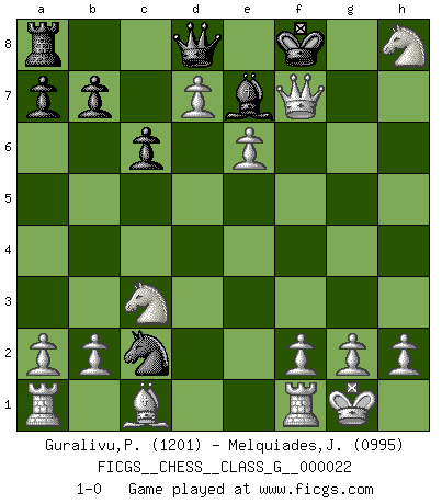 Last move : 1-0 2008 September 28 22:32:10 [Event "FICGS__CHESS__CLASS_G__000022"] [Site "FICGS"] [Date "2008.07.02"] [Round "1"] [White "Guralivu,Paul-Iosif"] [Black "Melquiades,Jay"] [Result "1-0"] [WhiteElo "1201"] [BlackElo "0995"] 1.e4 e5 2.Nf3 d6 3.Bc4 Be6 4.Bxe6 fxe6 5.O-O Nc6 6.Nc3 Nf6 7.d4 d5 8.dxe5 Nd7 9.exd5 Nb4 10.dxe6 Be7 11.exd7+ Kf8 12.e6 h5 13.Ne5 c6 14.Nf7 Qc7 15.Nxh8 Qd8 16.Qxh5 g6 17.Qxg6 Nxc2 18.Qf7+ 1-0 Philidor's defense Kingside Castling by player White (move 5) Player White won this chess game. Follow this game move after move (download)I won't play with you anymore. You have insulted my friend. - When an opponent cursed himself for a blunder. (Miguel Najdorf) In Buenos Aires ist es nicht mein vorrangiges Ziel ein starkes Turnier zu organisieren, sondern ein Turnier für Gentlemen. Ich würde nie Kamsky einladen. Ich mag keine Probleme. (Miguel Najdorf) Las piezas de Ajedrez son los bloques del alfabeto que moldean los pensamientos; y esos pensamientos, aunque hagan un diseño visual en el tablero, expresan abstractamente su belleza como un poema. (Marcel Duchamp) Les échecs sont un jeu terrible. Si vous n'avez pas le centre, votre adversaire a une position plus libre. Par contre, si vous avez le centre, alors vous avez vraiment quelque chose pour laquelle vous inquiéter ! (Siegbert Tarrasch) Warrior pose battles inner weakness and wins focus. You see that there is no war within you. You're on your own side, and you are your own strength. (Terri Guillemets)