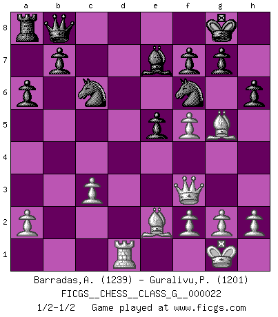 Last move : 1/2-1/2 2008 August 24 3:48:16 [Event "FICGS__CHESS__CLASS_G__000022"] [Site "FICGS"] [Date "2008.07.02"] [Round "1"] [White "Barradas,Anderson"] [Black "Guralivu,Paul-Iosif"] [Result "1/2-1/2"] [WhiteElo "1239"] [BlackElo "1201"] 1.e4 c5 2.Nf3 d6 3.d4 cxd4 4.Nxd4 Nf6 5.Nc3 a6 6.Bd3 e5 7.Nf5 Bxf5 8.exf5 Be7 9.O-O O-O 10.Qf3 Nc6 11.Be3 d5 12.Be2 d4 13.Rad1 Qb8 14.Nd5 Nxd5 15.Bc1 Nf6 16.c3 dxc3 17.bxc3 Rd8 18.Bg5 Rxd1 19.Rxd1 h6 1/2-1/2 Sicilian : Najdorf Kingside Castling by player White (move 9) Kingside Castling by player Black (move 9) This chess game ended in a draw. Follow this game move after move (download)Chess is a forcing house where the fruits of character can ripen more fully than in life. (Edward Morgan Foster) Schach ist ein Kampf gegen den Fehler. (Johannes Herrman Zukertort) Tu no necesitas jugar muy bien, únicamente ayudar a tu oponenet a que juegue muy mal. (Genrikh Chepukaitis) Avant la finale, les dieux ont créé le milieu de partie. (Tarrasch) The only thing that overcomes hard luck is hard work. (Harry Golden)