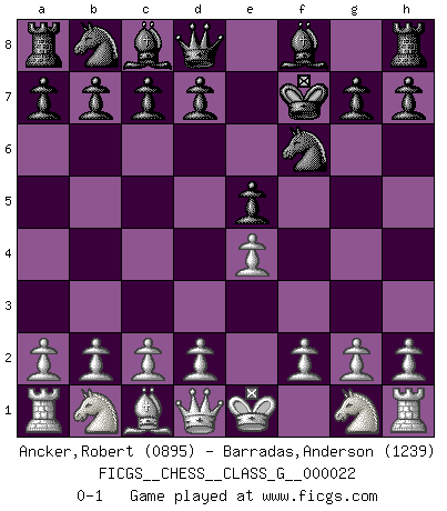Last move : 0-1 2008 August 27 19:20:58 [Event "FICGS__CHESS__CLASS_G__000022"] [Site "FICGS"] [Date "2008.07.02"] [Round "1"] [White "Ancker,Robert"] [Black "Barradas,Anderson"] [Result "0-1"] [WhiteElo "0895"] [BlackElo "1239"] 1.e4 e5 2.Bc4 Nf6 3.Bxf7+ Kxf7 0-1 This chess game has been lost on time (started : 2008.07.02 22:12:16) Bishop's Opening : Berlin defense Player Black won this chess game. Follow this game move after move (download)I don't believe in psychology. I believe in good moves. (Bobby Fischer) Die Arbeit ist etwas Unnatürliches. Die Faulheit allein ist göttlich. (Anatole France) El Ajedrez es un invernadero donde los frutos del carácter pueden madurar mas completamente que en la vida. (Edward Morgan Foster) La tactique est l'élément le plus important du milieu de jeu. (Siegbert Tarrasch) The intuitive mind is a sacred gift; the rational mind is a faithful servant. We have created a society that honors the servant but has forgotten the gift. (Albert Einstein)
