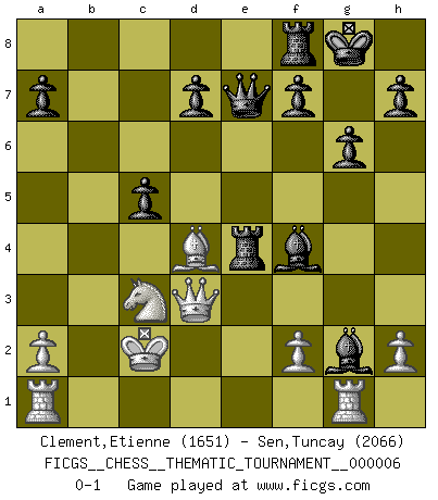 Last move : 0-1 2006 August 14 13:34:29 [Event "FICGS__CHESS__THEMATIC_TOURNAMENT__000006"] [Site "FICGS"] [Date "2006.07.23"] [Round "1"] [White "Clement,Etienne"] [Black "Sen,Tuncay"] [Result "0-1"] [WhiteElo "1651"] [BlackElo "2066"] 1.e4 e5 2.Nf3 Nc6 3.d4 exd4 4.Bc4 Bb4+ 5.c3 dxc3 6.bxc3 Bd6 7.Bd5 Nge7 8.Ng5 Nxd5 9.Qxd5 O-O 10.Qf5 g6 11.Qd5 Nb4 12.Qd1 b6 13.Be3 Qf6 14.Nf3 Ba6 15.Bd4 Rae8 16.Qd2 Rxe4+ 17.Kd1 Qe7 18.cxb4 Be2+ 19.Kc2 Bxf3 20.Nc3 Bf4 21.Qd3 Bxg2 22.Rhg1 c5 23.bxc5 bxc5 0-1 Scotch gambit Kingside Castling by player Black (move 9) Player Black won this chess game. Follow this game move after move (download)Chess is no whit inferior to the violin, and we have a large number of professional violinists. (Mikhail Botvinnik) Im Reiche der Wirklichkeit ist man nie so glücklich wie im Reiche der Gedanken. (Arthur Schopenhauer) ¿Se han dado cuenta de que Fischer casi nunca ha tenido piezas malas? El las intercambia y las piezas malas se quedan con sus oponenets. (Yuri Balashov) Votre seul travail dans les ouvertures est d'obtenir un milieu de partie jouable. (Lajos Portish) When it is a question of money, everybody is of the same religion. (Voltaire)