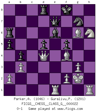 Last move : 0-1 2008 October 2 22:11:5 [Event "FICGS__CHESS__CLASS_G__000022"] [Site "FICGS"] [Date "2008.07.02"] [Round "1"] [White "Parker,Aaron"] [Black "Guralivu,Paul-Iosif"] [Result "0-1"] [WhiteElo "1046"] [BlackElo "1201"] 1.e4 c5 2.Bc4 e6 3.Nc3 Ne7 4.Nf3 d5 5.exd5 exd5 6.Bf1 Nbc6 7.Nb5 a6 8.Na3 Be6 9.c3 Ng6 10.g3 Bd6 11.Bg2 O-O 12.O-O b5 13.Ne1 Rc8 14.d3 Nce5 15.d4 cxd4 16.Qxd4 Bc5 17.Qd2 Qb6 18.Nac2 Ng4 19.Nd4 a5 20.Nd3 Bxd4 21.cxd4 Qxd4 22.h3 Nf6 23.Qe2 Ne4 24.Be3 Qc4 25.b3 Qc7 26.h4 Qd7 27.h5 Ne7 28.Bf4 Nf5 29.Ne5 Qb7 30.Ng4 Nd4 31.Qd1 Nf5 32.h6 Rfd8 33.hxg7 Nxg7 34.Nh6+ Kf8 35.Qd4 Qe7 36.Bxe4 f6 37.Bxh7 f5 38.Bg6 Rc7 39.Rae1 Rc6 40.Kg2 b4 41.Rh1 Ra6 0-1 Sicilian defense Kingside Castling by player Black (move 11) Kingside Castling by player White (move 12) Player Black won this chess game. Follow this game move after move (download)If one piece is badly posted, the whole game is bad. (Tarrasch) Früher wurde jeder komplizierte Zug, jedes interessante Opfer mit großem Beifall und Enthusiasmus aufgenommen. Heute schaltet man einfach seinen Fritz an, und man kann sehen, was los ist, ob der Zug geht oder nicht. (Vladimir Kramnik) Uno por uno, yo los acribillé, mi superioridad muy pronto se volvio aparente. (Jose Capablanca) Les Echecs sont et restent toujours un combat, un combat intégral comme la boxe, la lutte ou un autre sport, et où il doit y avoir un vainqueur et un vaincu. (Joseph Emil Diemer) He who laughs last probably does not get the joke. (Unknown)
