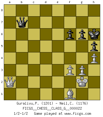 Last move : 1/2-1/2 2008 October 21 11:14:7 [Event "FICGS__CHESS__CLASS_G__000022"] [Site "FICGS"] [Date "2008.07.02"] [Round "1"] [White "Guralivu,Paul-Iosif"] [Black "Neil,Charlie"] [Result "1/2-1/2"] [WhiteElo "1201"] [BlackElo "1176"] 1.e4 e6 2.d4 d5 3.Nc3 Nf6 4.Bg5 Be7 5.e5 Nfd7 6.Bxe7 Qxe7 7.Nf3 a6 8.Be2 c5 9.dxc5 Qxc5 10.O-O Nc6 11.Na4 Qe7 12.c4 Ncxe5 13.cxd5 Nxf3+ 14.Bxf3 O-O 15.dxe6 Qxe6 16.Re1 Qg6 17.Rc1 Nf6 18.Nc5 Bh3 19.Nxb7 Rab8 20.Rc7 Nh5 21.g3 Nf4 22.Nc5 Rxb2 23.Qc1 Rxa2 24.Qxf4 Rc2 25.Nd7 Rxc7 26.Qxc7 Bxd7 27.Qxd7 a5 28.Qa4 Qa6 29.Re5 Qd3 30.Bg2 Qc3 31.Rxa5 Qe1+ 32.Bf1 g6 33.Ra8 Qe7 34.Rxf8+ Qxf8 35.Bc4 Kg7 36.Kg2 Qe7 37.h4 Qe4+ 38.Kg1 h5 39.Qb3 Qe1+ 40.Bf1 Qe5 41.Qf3 Qd4 42.Qg2 Kh6 43.Kh2 Qg4 44.f3 Qd4 45.Be2 Qd2 46.Bf1 Qd6 47.Kh1 Qb6 48.Qa2 Qb7 49.Kg2 f6 1/2-1/2 French : Classical variation Kingside Castling by player White (move 10) Kingside Castling by player Black (move 14) This chess game ended in a draw. Follow this game move after move (download)All my games are real. (Bobby Fischer) Die Leute spielen gegen mich seit 15 Jahren unter Ihren Möglichkeiten. (Robert James Fischer) El Ajedrez es imaginación. (David Bronstein) J'ai toujours senti une vague pitié pour l'homme qui ne connaît rien aux échecs, tout comme j'en aurais pour un homme ignorant de l'amour. Les Echecs, comme la musique ou comme l'amour, ont le pouvoir de rendre heureux. (Siegbert Tarrasch) Life is like a game of cards: the hand you are dealt represents determinism; the way you play it is free will. (Jawaharlal Nehru)