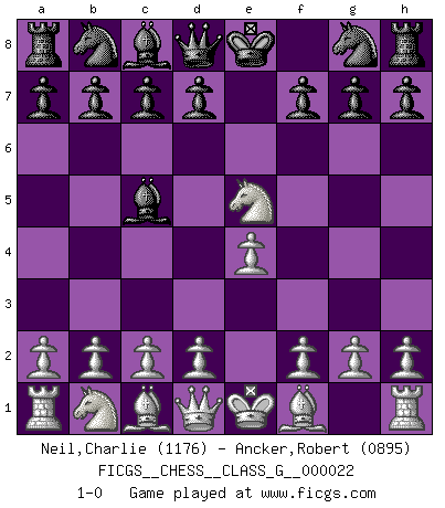 Last move : 1-0 2008 August 13 18:0:21 [Event "FICGS__CHESS__CLASS_G__000022"] [Site "FICGS"] [Date "2008.07.02"] [Round "1"] [White "Neil,Charlie"] [Black "Ancker,Robert"] [Result "1-0"] [WhiteElo "1176"] [BlackElo "0895"] 1.e4 e5 2.Nf3 Bc5 3.Nxe5 1-0 This chess game has been lost on time (started : 2008.07.02 22:12:16) King's knight Opening Player White won this chess game. Follow this game move after move (download)Even the laziest King flees wildly in the face of a double check ! (Aaron Nimzowitsch) Im Hotelzimmer gab es nur zwei Schaben. (Über die Turnierbedingungen) (Peter Swidler) Nunca nadie ha ganado una partida de Ajedrez rindiendose. (Unknown) Les sacrifices démontrent seulement que quelqu'un a gaffé. (Savielly Tartacover) Perception is reality. (Immanuel Kant)