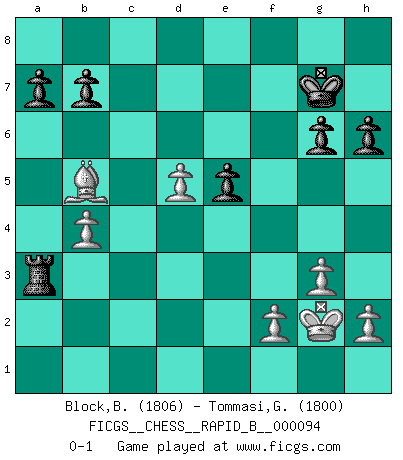Last move : 0-1 2008 October 8 19:2:24 [Event "FICGS__CHESS__RAPID_B__000094"] [Site "FICGS"] [Date "2008.07.03"] [Round "1"] [White "Block,Benjamin"] [Black "Tommasi,Giancarlo"] [Result "0-1"] [WhiteElo "1806"] [BlackElo "1800"] 1.d4 f5 2.c4 Nf6 3.Nc3 g6 4.g3 d6 5.Nf3 Bg7 6.Bg2 O-O 7.O-O Qe8 8.d5 Na6 9.Rb1 Bd7 10.b4 c6 11.Bg5 Rc8 12.Qd3 Nc7 13.Rfc1 cxd5 14.cxd5 Ne4 15.Nxe4 fxe4 16.Qxe4 Bf5 17.Qxe7 Bxb1 18.Rxb1 h6 19.Qxe8 Rcxe8 20.Bd2 Rxe2 21.Be1 Rxa2 22.Rd1 Nb5 23.Bf1 Rxf3 24.Bxb5 Ra1 25.Rxa1 Bxa1 26.Kg2 Ra3 27.Bd2 Kg7 28.Bf4 Be5 29.Bxe5+ dxe5 0-1 Dutch with c4 & Nc3 Kingside Castling by player Black (move 6) Kingside Castling by player White (move 7) Player Black won this chess game. Follow this game move after move (download)When you play Bobby, it is not a question if you win or lose. It is a question if you survive. (Boris Spassky) Man wirke der falschen Auffassung entgegen, als ob jeder Zug Unmittelbares zu leisten habe; auch Werte- und Ruhezüge haben ihre Existenzberechtigung. (Aaron Nimzowitsch) Es el objetivo de la escuela moderna no tratar cada posición de acuerdo a una regla general, sino de acuerdo al principio inherente en la posición. (Richard Reti) Je ne crois pas en la psychologie, je crois aux bons coups. (Robert Fischer) Never risk one's whole fortune unless supported by one's entire army. (Niccolo Machiavelli)