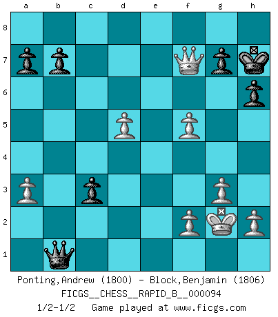 Last move : 1/2-1/2 2008 September 11 15:56:18 [Event "FICGS__CHESS__RAPID_B__000094"] [Site "FICGS"] [Date "2008.07.03"] [Round "1"] [White "Ponting,Andrew"] [Black "Block,Benjamin"] [Result "1/2-1/2"] [WhiteElo "1800"] [BlackElo "1806"] 1.d4 e6 2.c4 Nf6 3.Nc3 Bb4 4.Bg5 c5 5.d5 h6 6.Bh4 d6 7.e3 O-O 8.Bd3 exd5 9.cxd5 Nbd7 10.Nge2 Ne5 11.O-O Ng6 12.Bg3 Nh5 13.Nf4 Ngxf4 14.Bxf4 Nxf4 15.exf4 Qf6 16.Qd2 Bf5 17.Bxf5 Qxf5 18.a3 Bxc3 19.bxc3 Rfe8 20.g3 Re7 21.Rfe1 Rae8 22.c4 Rxe1+ 23.Rxe1 Re4 24.Rxe4 Qxe4 25.Qa5 Qxc4 26.Qd8+ Kh7 27.Qxd6 Qc2 28.Qd7 c4 29.Qxf7 c3 30.f5 Qb1+ 31.Kg2 1/2-1/2 Queen's pawn Kingside Castling by player Black (move 7) Kingside Castling by player White (move 11) This chess game ended in a draw. Follow this game move after move (download)Chess is so inspiring that I do not believe a good player is capable of having an evil thought during the game. (Wilhelm Steinitz) Es hat in meinem Leben Zeiten gegeben, in denen das Schachspiel, wenn nicht zum Lebenszweck, so doch zu einem regelrechten Lebensersatz geworden ist. Man fühlt sich in solchen Zeiten nicht so, als besäße man eine göttliche Gabe, sondern eher so, als sei man von ihr besessen. (Garry Kasparov) EL Ajedrez es como la vida. (Boris Spassky) Si rien de grave n'est détecté lors de l'analyse d'une position, on joue alors le coup. Seconde règle de Blumenfeld. There are two kinds of people in the world, my friend. Those who have a loaded gun and those who dig. You dig ! (Blondie in The Good, The Bad and The Ugly)