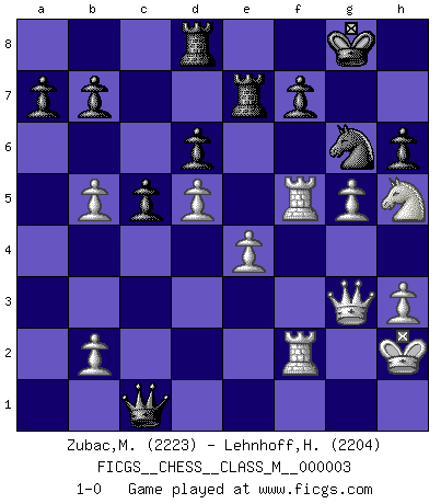 Last move : 1-0 2006 December 8 20:15:24 [Event "FICGS__CHESS__CLASS_M__000003"] [Site "FICGS"] [Date "2006.04.15"] [Round "1"] [White "Zubac,Marius"] [Black "Lehnhoff,Heinz-Georg"] [Result "1-0"] [WhiteElo "2223"] [BlackElo "2204"] 1.d4 Nf6 2.c4 e6 3.Nc3 c5 4.d5 exd5 5.cxd5 d6 6.e4 g6 7.Bd3 Bg7 8.Nge2 O-O 9.O-O Na6 10.f3 Nc7 11.Bg5 h6 12.Bh4 Rb8 13.a4 Re8 14.Qb3 Bd7 15.h3 g5 16.Bg3 Qe7 17.Bh2 Nh5 18.g4 Nf6 19.Bb5 Red8 20.Bxd7 Nxd7 21.Ng3 Be5 22.Nf5 Bxh2+ 23.Kxh2 Qf6 24.f4 gxf4 25.Rxf4 Ne5 26.Raf1 Rd7 27.Nb5 Nxb5 28.axb5 Qg5 29.Ng3 Ng6 30.Rf5 Qd2+ 31.R1f2 Qc1 32.Nh5 Re7 33.Qg3 Rd8 34.g5 1-0 Queen's pawn game Kingside Castling by player Black (move 8) Kingside Castling by player White (move 9) Player White won this chess game. Follow this game move after move (download)Chess, like love, like music, has the power to make people happy. (Siegbert Tarrasch) Als ich elf wurde, wurde ich einfach gut. (Robert James Fischer) El Ajedrez, como la música, como el amor, tiene el poder de hacer feliz a la gente. (Siegbert Tarrasch) Les échecs, c'est la lutte contre l'erreur. (Johannes Zukertort) Your best chance to get a Royal Flush in a casino is in the bathroom. (Anonymous)