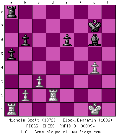 Last move : 1-0 2008 September 5 19:51:58 [Event "FICGS__CHESS__RAPID_B__000094"] [Site "FICGS"] [Date "2008.07.03"] [Round "1"] [White "Nichols,Scott"] [Black "Block,Benjamin"] [Result "1-0"] [WhiteElo "1872"] [BlackElo "1806"] 1.e4 e5 2.Nf3 Nc6 3.Bb5 a6 4.Ba4 b5 5.Bb3 Nf6 6.O-O Bc5 7.c3 d6 8.d4 Bb6 9.Be3 Bg4 10.Nbd2 O-O 11.h3 Bh5 12.Bg5 exd4 13.Bd5 Qd7 14.Bxf6 gxf6 15.Bxc6 Qxc6 16.Nxd4 Bxd1 17.Nxc6 Bh5 18.a4 Rfe8 19.Nb4 Kg7 20.Nd5 bxa4 21.Rfe1 a3 22.Rxa3 Bg6 23.Ra4 Re6 24.Nxb6 cxb6 25.Rea1 a5 26.f4 f5 27.g4 fxe4 28.f5 e3 29.fxe6 exd2 30.Rd4 fxe6 31.Rxd6 h5 32.Rxd2 hxg4 33.hxg4 1-0 Ruy Lopez : Caro variation Kingside Castling by player White (move 6) Kingside Castling by player Black (move 10) Player White won this chess game. Follow this game move after move (download)I look one move ahead... the best ! (Siegbert Tarrasch) Wer sich die Fähigkeit anerziehen will im Schach selbstständig zu denken, der muß alles meiden, was leblos ist: ausgeklügelte Theorien, die sich auf sehr wenige Beispiele und eine Menge Hirngespinste stützen. (Emanuel Lasker) Cuando no sepas que mover, espera por una idea que se le venga a la la cabeza de tu oponente. Tenlo por seguro de que esa idea estará incorrecta. (Siegbert Tarrasch) La menace est plus forte que l'exécution. (Aaron Nimzovitch) There are 10 types of people in this world: those who understand binary and those who don't. (Anonymous)