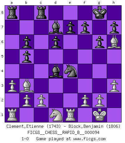 Last move : 1-0 2008 September 24 22:25:17 [Event "FICGS__CHESS__RAPID_B__000094"] [Site "FICGS"] [Date "2008.07.03"] [Round "1"] [White "Clement,Etienne"] [Black "Block,Benjamin"] [Result "1-0"] [WhiteElo "1743"] [BlackElo "1806"] 1.e4 c5 2.Nc3 Nc6 3.Nf3 d6 4.d4 cxd4 5.Nxd4 Nf6 6.Bb5 Bd7 7.Bc4 g6 8.O-O Bg7 9.Be3 O-O 10.Nde2 Ng4 11.Bg5 Qa5 12.Qd2 Be5 13.h3 Nf6 14.Bh6 Rfc8 15.Bb3 b5 16.Qe3 Qb6 17.Qxb6 axb6 18.a3 Nd4 19.Nxd4 Bxd4 20.Nd1 Nxe4 21.Re1 1-0 This chess game has been lost on time (started : 2008.07.03 1:32:59) Sicilian : Closed, 2...Nc6 Kingside Castling by player White (move 8) Kingside Castling by player Black (move 9) Player White won this chess game. Follow this game move after move (download)I give 98 percent of my mental energy to Chess. Others give only 2 percent. (Bobby Fischer) Schach ist wie eine schöne Frau, zu der wir ständig zurückkehren, gleichviel, wie oft sie uns zurückweist. (Anonymous) La partida mas dura de ganar es una partida ganada. (Emanuel Lasker) Plusieurs personnes se sont demandées comment Tal faisait pour gagner... En fait, c'est très simple ! Il met ses pièces au centre de l'échiquier et les sacrifie quelque part ! (David Bronstein) Vladimir Ras-Putin is still alive... He is also a good actor, I saw him in the Lord of the Rings. (Rodolfo d'Ettorre)
