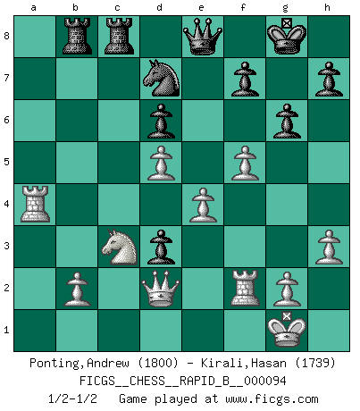 Last move : 1/2-1/2 2008 July 25 21:18:11 [Event "FICGS__CHESS__RAPID_B__000094"] [Site "FICGS"] [Date "2008.07.03"] [Round "1"] [White "Ponting,Andrew"] [Black "Kirali,Hasan"] [Result "1/2-1/2"] [WhiteElo "1800"] [BlackElo "1739"] 1.d4 Nf6 2.c4 c5 3.d5 e6 4.Nc3 exd5 5.cxd5 d6 6.e4 g6 7.f4 Bg7 8.Bb5+ Nfd7 9.a4 O-O 10.Nf3 Na6 11.O-O Nc7 12.Bd3 a6 13.Qe1 Rb8 14.a5 b5 15.axb6 Nxb6 16.f5 Nd7 17.Bg5 Qe8 18.Qd2 Nb5 19.Bh6 Nd4 20.Bxg7 Kxg7 21.Nxd4 cxd4 22.Ne2 Qe5 23.Bxa6 Bxa6 24.Rxa6 d3 25.Nc3 Kg8 26.Ra4 Rfc8 27.Rf2 Qe8 28.h3 1/2-1/2 Benoni : pawn storm variation Kingside Castling by player Black (move 9) Kingside Castling by player White (move 11) This chess game ended in a draw. Follow this game move after move (download)I like to say that Bobby Fischer was the greatest player ever. But what made Fischer a genius was his ability to blend an American freshness and pragmatism with Russian ideas about strategy. (Bruce Pandolfini) Gott hat gewollt, dass ich Champion werde. (Surab Azmajparaschvili) Botvinnik trataba de restarle el misterio al Ajedrez, siempre relacionandolo a situaciones de la vida ordinaria. El gustaba de llamar al Ajedrez un típico problema inexacto similar a aquellos de los cuales la gente siempre tiene que enfrentarse en la vida cotidiana. (Garry Kasparov) La solitude du joueur d'Echecs à l'approche du mat est semblable à celle du condamné. (Francis Szpiner) The right perception of any matter and a misunderstanding of the same matter do not wholly exclude each other. (Kafka's the trial)