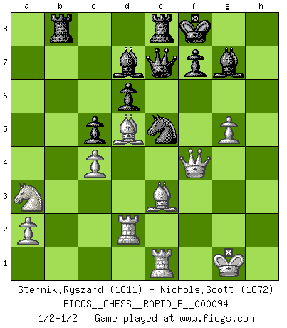 Last move : 1/2-1/2 2008 July 10 20:29:6 [Event "FICGS__CHESS__RAPID_B__000094"] [Site "FICGS"] [Date "2008.07.03"] [Round "1"] [White "Sternik,Ryszard"] [Black "Nichols,Scott"] [Result "1/2-1/2"] [WhiteElo "1811"] [BlackElo "1872"] 1.e4 c5 2.Nf3 e6 3.d4 cxd4 4.Nxd4 Nc6 5.Nb5 d6 6.c4 Nf6 7.N1c3 a6 8.Na3 Be7 9.Be2 O-O 10.O-O b6 11.Be3 Bb7 12.Qb3 Nd7 13.Rfd1 Nc5 14.Qc2 Qc7 15.Qd2 Rfd8 16.Nc2 Bf6 17.Bg5 Nd7 18.Be3 Be7 19.f4 Nf6 20.Bf3 Rac8 21.Qf2 Nd7 22.Na4 Nc5 23.Nxc5 bxc5 24.Rab1 a5 25.b3 Bf6 26.g4 h6 27.h4 g6 28.g5 hxg5 29.hxg5 Bc3 30.Kg2 Ne7 31.Rd3 Bg7 32.Rbd1 Ba6 33.R3d2 Rb8 34.Na3 Nc6 35.Qh4 Kf8 36.Qh7 Qe7 37.Nc2 Bb7 38.Kg1 a4 39.bxa4 Na5 40.Na3 Bc6 41.Kf2 Bxa4 42.Re1 Nc6 43.f5 exf5 44.exf5 gxf5 45.Qxf5 Ne5 46.Bd5 Bd7 47.Qf4 Re8 48.Kg1 1/2-1/2 Sicilian, Szen (`anti-Taimanov') variation Kingside Castling by player Black (move 9) Kingside Castling by player White (move 10) This chess game ended in a draw. Follow this game move after move (download)Every Pawn is a potential Queen. (James Mason) Schach ist Kampf, hauptsächlich jedoch gegen die eigenen Fehler. (Savielly Grigorievitsch Tartakower) Yo jugué Ajedrez con el y a veces le pude haber ganado solo que siempre devuelve su última jugada y juega la partida de manera diferente. (Mark Twain) 'L'échange des dames est un coup dur pour les deux adversaires...' Un journaliste lors d'une partie du match Spassky-Fischer Depression is just anger without enthusiasm. (Unknown)