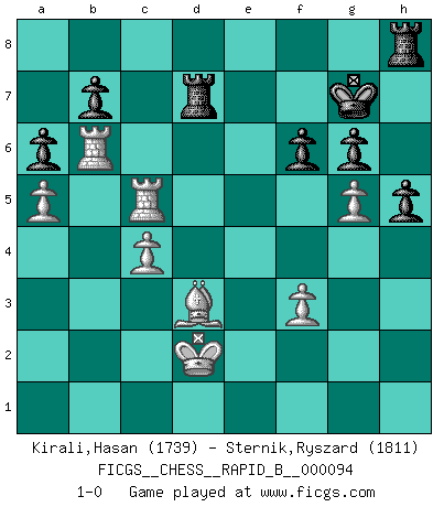 Last move : 1-0 2008 August 12 20:24:46 [Event "FICGS__CHESS__RAPID_B__000094"] [Site "FICGS"] [Date "2008.07.03"] [Round "1"] [White "Kirali,Hasan"] [Black "Sternik,Ryszard"] [Result "1-0"] [WhiteElo "1739"] [BlackElo "1811"] 1.e4 e5 2.d4 exd4 3.Qxd4 Nc6 4.Qe3 Nf6 5.Nc3 Bb4 6.Bd2 O-O 7.O-O-O Re8 8.Qg3 Rxe4 9.a3 Rg4 10.Qe3 Ba5 11.f3 Rd4 12.Bd3 Bxc3 13.Bxc3 Nd5 14.Qd2 Nxc3 15.Qxc3 Ra4 16.Bc4 Ra5 17.Ne2 d6 18.Rhe1 Rc5 19.b4 Rg5 20.h4 Rh5 21.b5 Ne7 22.g4 Rxh4 23.Nf4 Rh6 24.Nh5 Nf5 25.Bd3 Qf8 26.Nf4 Ng3 27.Rg1 Qd8 28.Rxg3 Qg5 29.Qd2 Bd7 30.Ne2 Qe7 31.Qf4 d5 32.Qb4 Qe3+ 33.Kb2 c5 34.Qf4 Re8 35.Bc4 Bxb5 36.Qxe3 Rxe3 37.Bxb5 Rb6 38.a4 Rxe2 39.Rxd5 g6 40.Kc1 Re7 41.Rxc5 Rd6 42.Bc4 Kg7 43.Rc8 h6 44.Rh3 a6 45.Kb2 R6d7 46.Rc5 Re1 47.Kc3 Rb1 48.Bd3 Re1 49.a5 Re3 50.Kd2 Re6 51.Rh1 Re8 52.Re1 Rh8 53.R1e5 f6 54.Re6 Kf7 55.Rb6 Kg7 56.c4 h5 57.g5 1-0 Centre game : Berger variation Kingside Castling by player Black (move 6) Queenside Castling by player White (move 7) Player White won this chess game. Follow this game move after move (download)A great player and a great example for many. His book My 60 Memorable Games had a big impact on me. It is a shame he didn't continue to enrich the world of chess with his unparalleled understanding after 1972. (Jan Timman, about Bobby Fischer's death) Ich bin es gewohnt, das die Jugend mir überhaupt keinen Respekt entgegenbringt. (Alexander Morozewich) Si tu oponente te ofrece un empate, trata de averiguar porque piensa él que esta en una posición peor. (Nigel Short) J'ai toujours senti une vague pitié pour l'homme qui ne connaît rien aux échecs, tout comme j'en aurais pour un homme ignorant de l'amour. Les Echecs, comme la musique ou comme l'amour, ont le pouvoir de rendre heureux. (Siegbert Tarrasch) Memory is a way of holding onto the things you love, the things you are, the things you never want to lose. (from the television show: The Wonder Years)