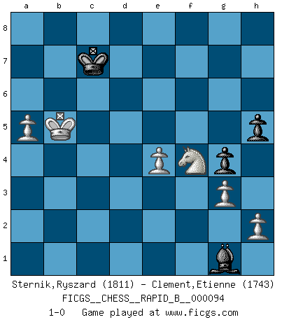 Last move : 1-0 2008 September 19 6:56:24 [Event "FICGS__CHESS__RAPID_B__000094"] [Site "FICGS"] [Date "2008.07.03"] [Round "1"] [White "Sternik,Ryszard"] [Black "Clement,Etienne"] [Result "1-0"] [WhiteElo "1811"] [BlackElo "1743"] 1.e4 c5 2.Nf3 d6 3.d4 cxd4 4.Nxd4 Nf6 5.Nc3 e5 6.Bb5+ Bd7 7.Bxd7+ Qxd7 8.Nde2 Nc6 9.Bg5 Be7 10.Bxf6 Bxf6 11.Nd5 Bh4 12.O-O O-O 13.Qd3 Rac8 14.c3 Be7 15.Ng3 g6 16.Rad1 Rcd8 17.Ne2 Kg7 18.f3 f5 19.c4 fxe4 20.fxe4 Rxf1+ 21.Rxf1 Qg4 22.b4 Bh4 23.a3 Ne7 24.Nec3 Nxd5 25.Nxd5 Rf8 26.Rxf8 Kxf8 27.a4 h5 28.a5 Kf7 29.Nc7 Kf8 30.Nb5 Qf4 31.g3 Qc1+ 32.Qf1+ Qxf1+ 33.Kxf1 Bg5 34.Ke2 a6 35.Nxd6 Be7 36.Nxb7 Bxb4 37.c5 Ke7 38.c6 Bc3 39.Kd3 Be1 40.Kc4 Ke6 41.Nc5+ Kd6 42.Nxa6 Kxc6 43.Nb4+ Kc7 44.Kb5 Bf2 45.Nc6 g5 46.Nxe5 g4 47.Nd3 Bg1 48.Nf4 1-0 Sicilian : Venice attack Kingside Castling by player White (move 12) Kingside Castling by player Black (move 12) 10 pieces endgame at move 46 : White KNPPPP , Black KBPP WHITE : King + 1 Knight 4 Pawns BLACK : King + 1 Bishop 2 Pawns Player White won this chess game. Follow this game move after move (download)There is no remorse like the remorse of Chess. (H. G. Wells) Ich verstehe Aljechins Kombinationen ganz gut; aber woher er diese Angriffschancen bekommt und wie er die Eröffnung behandelt das ist für mich ein Buch mit sieben Siegeln. (Rudolf Spielmann) No solamente yo pronostico su triunfo sobre Botvinnik, sino que me adelanto y digo que probablemente Fischer es el jugador de Ajedrez mas grande que haya existido. (John Collins) À la honte des hommes, on sait que les lois du jeu sont les seules qui soient partout justes, claires, inviolables et exécutées. Pourquoi l'Indien qui a donné les règles du jeu d'échecs est-il obéi de bon gré dans toute la terre, et que les décrétales des papes, par exemple, sont aujourd'hui un objet d'horreur et de mépris ? C'est que l'inventeur des échecs combina tout avec justesse pour la satisfaction des joueurs, et que les papes, dans leurs décrétales, n'eurent en vue que leur seul avantage. L'Indien voulut exercer également l'esprit des hommes et leur donner du plaisir; les papes ont voulu abrutir l'esprit des hommes. Voltaire (Dictionnaire philosophique / Garnier 1967) There are two types of people in this world, good and bad. The good sleep better, but the bad seem to enjoy the waking hours much more. (Woody Allen)