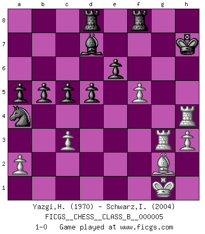 Last move : 1-0 2007 January 27 18:32:13 [Event "FICGS__CHESS__CLASS_B__000005"] [Site "FICGS"] [Date "2006.07.24"] [Round "1"] [White "Yazgi,Huseyin Yigit"] [Black "Schwarz,Ingo"] [Result "1-0"] [WhiteElo "1970"] [BlackElo "2004"] 1.e4 c5 2.Nc3 g6 3.g3 Bg7 4.Bg2 Nc6 5.d3 e6 6.f4 Nge7 7.Nf3 d5 8.O-O O-O 9.e5 Nf5 10.Ne2 h5 11.Bd2 f6 12.exf6 Bxf6 13.c3 Bd7 14.Rb1 a5 15.h3 b5 16.g4 Nh4 17.Nxh4 Bxh4 18.gxh5 gxh5 19.f5 Bg5 20.Ng3 h4 21.Qg4 Ne5 22.Qxg5+ Qxg5 23.Bxg5 hxg3 24.Rbe1 Nxd3 25.Re3 Nxb2 26.Rxg3 Kh7 27.Rf4 Na4 28.Bd8 Raxd8 29.Rh4+ 1-0 Sicilian : Closed Kingside Castling by player White (move 8) Kingside Castling by player Black (move 8) Player White won this chess game. Follow this game move after move (download)Some part of a mistake is always correct. (Savielly Tartakover) Schach sollte überall auf der Welt Schulfach werden. Es fördert die geistige Auseinandersetzung. Es lehrt die Demut in der Niederlage. (Garry Kasparov) Cuando estes solo, cuando te sientas un extraño en el mundo, juega al Ajedrez. Esto levantará tu espiritu y será tu consejero de guerra. (Aristóteles) Les Echecs sont affaire de jugement sensible. Savoir quand frapper et quand esquiver. (Fischer) The production of too many useful things results in too many useless people. (Karl Marx)