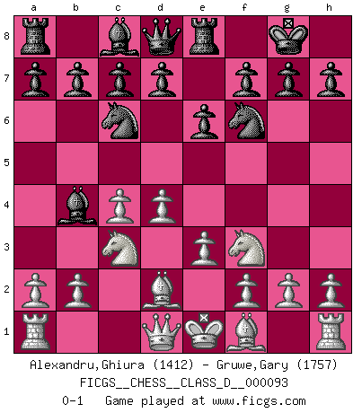 Last move : 0-1 2008 August 14 6:4:25 [Event "FICGS__CHESS__CLASS_D__000093"] [Site "FICGS"] [Date "2008.07.03"] [Round "1"] [White "Alexandru,Ghiura"] [Black "Gruwe,Gary"] [Result "0-1"] [WhiteElo "1412"] [BlackElo "1757"] 1.d4 Nf6 2.c4 e6 3.Nc3 Bb4 4.Nf3 Nc6 5.Bd2 O-O 6.e3 Re8 0-1 This chess game has been lost on time (started : 2008.07.03 21:34:3) Nimzo-Indian : Three knights variation Kingside Castling by player Black (move 5) Player Black won this chess game. Follow this game move after move (download)A bad day of Chess is better than any good day at work. (Anonymous) Frage des Reporters: -Worin besteht das Ziel von Gambiteröffnungen? Antwort: -Auf Kosten der Partie einen Ruf als Angriffspieler zu erwerben.- (Siegbert Tarrasch) El Ajedrez es el arte del análisis. (Mikhail Botvinnik) Les échecs sont utiles à l'exercice de la faculté de penser et à celle de l'imagination. Car nous devons posséder une méthode élaborée pour atteindre des buts partout où nous devons conduire notre raison. (Leibnitz) It's not enough to succeed. Others must fail. (Gore Vidal)