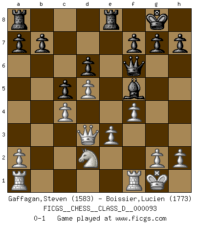 Last move : 0-1 2008 November 6 7:53:41 [Event "FICGS__CHESS__CLASS_D__000093"] [Site "FICGS"] [Date "2008.07.03"] [Round "1"] [White "Gaffagan,Steven"] [Black "Boissier,Lucien"] [Result "0-1"] [WhiteElo "1583"] [BlackElo "1773"] 1.c4 e5 2.Nc3 Nf6 3.Nf3 Bb4 4.Nxe5 O-O 5.d4 d6 6.Nf3 c5 7.d5 Ne4 8.Bd2 Bxc3 9.bxc3 Qf6 10.e3 Nxc3 11.Qc1 Ne4 12.Bd3 Nxd2 13.Nxd2 Nd7 14.O-O Ne5 15.Qc2 Nxd3 16.Qxd3 Re8 17.f4 Bf5 0-1 This chess game has been lost on time (started : 2008.07.03 21:34:3) English Opening Kingside Castling by player Black (move 4) Kingside Castling by player White (move 14) Player Black won this chess game. Follow this game move after move (download)Chess is above all, a fight ! (Emanuel Lasker) Nie in meinem Leben habe ich die französische Verteidigung gespielt, welche die Stumpfsinnigste von allen ist. (Wilhelm Steinitz) El jugador blanco perdió porque fallo en recordar la coreccta continuación y tuvo que pensar por sí mismo las movidas. (Siegbert Tarrasch) Ne tendez aucun piège pour le plaisir ! Ne jouez rien dans l'espoir que l'adversaire réagisse de façon stupide ! Prenez toujours pour acquis que l'adversaire va trouver le meilleur coup ! Ne jouez jamais de coup dans l'espoir que l'adversaire ne voie pas la menace ! Chacun de vos coups doit améliorer la position d'une façon ou d'une autre. Even the best needles are not sharp at both ends. (Chinese proverb)