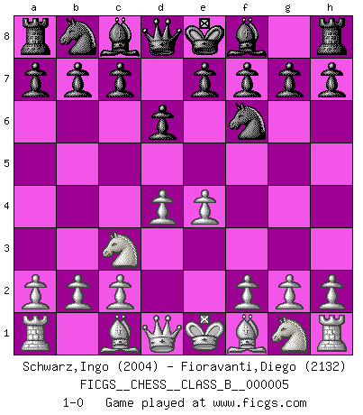 Last move : 1-0 2006 August 15 19:19:12 [Event "FICGS__CHESS__CLASS_B__000005"] [Site "FICGS"] [Date "2006.07.24"] [Round "1"] [White "Schwarz,Ingo"] [Black "Fioravanti,Diego"] [Result "1-0"] [WhiteElo "2004"] [BlackElo "2132"] 1.e4 d6 2.d4 Nf6 3.Nc3 1-0 Pirc defense Player White won this chess game. Follow this game move after move (download)A big shock; the best chess player in history has passed away. (Lajos Portisch, about Bobby Fischer's death) Karpov ist ein Museumsstück. (Garry Kasparov) Una victoria por una combinación errónea, aunque sea espectacular, me llena de horror artístico. (Wilhelm Steinitz) Les échecs, c'est la lutte contre l'erreur. (Johannes Zukertort) I believe in luck. How else can you explain the success of those you dislike ? (Jean Cocteau)