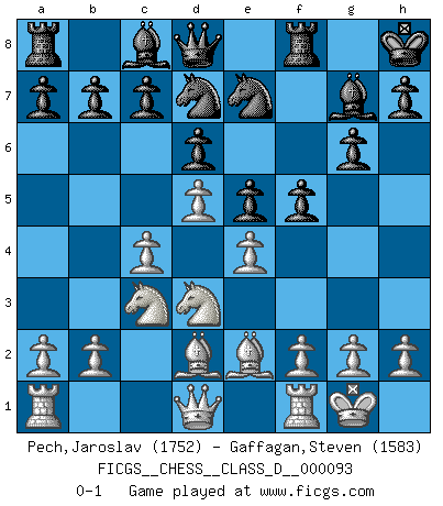 Last move : 0-1 2008 November 10 8:34:3 [Event "FICGS__CHESS__CLASS_D__000093"] [Site "FICGS"] [Date "2008.07.03"] [Round "1"] [White "Pech,Jaroslav"] [Black "Gaffagan,Steven"] [Result "0-1"] [WhiteElo "1752"] [BlackElo "1583"] 1.d4 Nf6 2.c4 g6 3.Nc3 Bg7 4.e4 d6 5.Nf3 O-O 6.Be2 e5 7.O-O Nc6 8.d5 Ne7 9.Ne1 Nd7 10.Nd3 f5 11.Bd2 Kh8 0-1 This chess game has been lost on time (started : 2008.07.03 21:34:3) King's Indian : Orthodox, Aronin-Taimanov variation (Yugoslav attack / Mar del Plata variation) Kingside Castling by player Black (move 5) Kingside Castling by player White (move 7) Player Black won this chess game. Follow this game move after move (download)Fischer is the strongest player in the world. In fact, the strongest player who ever lived. (Larry Evans) Schach ist wie eine schöne Frau, zu der wir ständig zurückkehren, gleichviel, wie oft sie uns zurückweist. (Anonymous) La única cosa que los jugadores de Ajedrez tienen en común, es el Ajedrez. (Lodewijk Prins) 'L'échange des dames est un coup dur pour les deux adversaires...' Un journaliste lors d'une partie du match Spassky-Fischer Follow your passion, and success will follow you. (Arthur Buddhold)