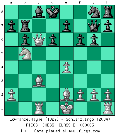Last move : 1-0 2006 August 25 9:58:55 [Event "FICGS__CHESS__CLASS_B__000005"] [Site "FICGS"] [Date "2006.07.24"] [Round "1"] [White "Lowrance,Wayne"] [Black "Schwarz,Ingo"] [Result "1-0"] [WhiteElo "1827"] [BlackElo "2004"] 1.Nf3 g6 2.e4 c5 3.c3 Bg7 4.d4 cxd4 5.cxd4 Nc6 6.Nc3 d6 7.Be2 Qb6 8.Be3 Qxb2 9.Nb5 Kd8 10.Bd2 Nxd4 11.Nfxd4 Bxd4 12.Nxd4 b6 13.Nb5 Qg7 14.Bc3 f6 15.Qd5 Rb8 16.Qc6 Rb7 17.Rc1 1-0 Reti Opening Player White won this chess game. Follow this game move after move (download)Chess is thirty to forty percent psychology. You don't have this when you play a computer. I can't confuse it. (Judith Polgar) Das Schachspiel ist ein See, in welchem eine Mücke baden und ein Elefant ertrinken kann. (Emanuel Lasker) Fischer era un maestro de claridad y un Rey del posicionamiento astuto. Sus oponentes podían ver hacia donde se dirigía pero eran impotentes para detenerlo. (Bruce Pandolfini) Les échecs sont un jeu par leur forme, un art par leur essence et une science par sa difficulté d'acquisition. Ils peuvent vous procurer autant de plaisir qu'un bon livre ou une belle musique, mais vous n'aurez une réelle joie que si vous arrivez à bien jouer. (Tigran Petrosian) Tomorrow's what you make of it. (Horatio Caine, C.S.I. Miami)
