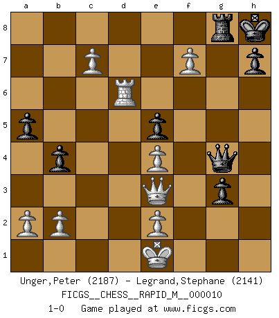 Last move : 1-0 2008 September 21 17:47:34 [Event "FICGS__CHESS__RAPID_M__000010"] [Site "FICGS"] [Date "2008.07.04"] [Round "1"] [White "Unger,Peter"] [Black "Legrand,Stephane"] [Result "1-0"] [WhiteElo "2187"] [BlackElo "2141"] 1.d4 Nf6 2.Nf3 e6 3.c4 d5 4.g3 Be7 5.Bg2 O-O 6.O-O dxc4 7.Qc2 a6 8.Qxc4 b5 9.Qc2 Bb7 10.Bd2 Be4 11.Qc1 Bb7 12.Bf4 Bd6 13.Rd1 Nbd7 14.Nc3 Qb8 15.Ne5 Bxg2 16.Kxg2 Nb6 17.Nd3 Rc8 18.f3 b4 19.Ne4 Nxe4 20.fxe4 Qb7 21.Qe3 Nd7 22.Kh3 Qb5 23.Rac1 a5 24.Rf1 Bxf4 25.Rxf4 c5 26.dxc5 e5 27.Rf5 f6 28.g4 Rc6 29.g5 Rf8 30.Kg2 Re6 31.h4 Qb7 32.Nf2 Rc6 33.Ng4 Kh8 34.h5 Rg8 35.Kh3 Qc8 36.h6 Qe8 37.Rd1 Re6 38.Qd2 Qh5+ 39.Kg3 g6 40.Rxf6 Nxf6 41.Nxf6 Rxf6 42.gxf6 g5 43.Qe3 Qxh6 44.Rd6 Qh4+ 45.Kg2 Qg4+ 46.Kf1 Qh4 47.c6 g4 48.c7 g3 49.Ke1 Qg4 50.f7 1-0 Queen's pawn game Kingside Castling by player Black (move 5) Kingside Castling by player White (move 6) Player White won this chess game. Follow this game move after move (download)With or without the title, Bobby Fischer was unquestionably the greatest player of his time. (Burt Hochberg) Ich verachte die Medien. (Robert James Fischer) Yo adoro todas la posiciones. Denme una partida posicional difícil, y la jugaré. Pero posiciones totalmente ganadas, no las tolero. (Hein Donner) Pour se monter efficace, un Cavalier a besoin d'avant-postes ! Les Cavaliers font les meilleurs bloqueurs de pions passés. The next best thing to gambling and winning is gambling and loosing. (Nick Dandalos)