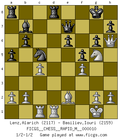 Last move : 1/2-1/2 2008 September 7 13:29:4 [Event "FICGS__CHESS__RAPID_M__000010"] [Site "FICGS"] [Date "2008.07.04"] [Round "1"] [White "Lenz,Alarich"] [Black "Basiliev,Iouri"] [Result "1/2-1/2"] [WhiteElo "2117"] [BlackElo "2159"] 1.d4 d5 2.c4 c6 3.Nc3 Nf6 4.e3 e6 5.Nf3 Nbd7 6.Qc2 Bd6 7.Be2 O-O 8.O-O b6 9.e4 Nxe4 10.Nxe4 dxe4 11.Qxe4 Bb7 12.Rd1 Qc7 13.Bd3 g6 14.Qh4 c5 15.dxc5 Nxc5 16.Be2 Rfd8 17.Be3 f5 18.Rac1 Be7 19.Bg5 Bxg5 20.Nxg5 Qe7 21.Qh6 a5 22.f4 1/2-1/2 QGD Slav defense Kingside Castling by player Black (move 7) Kingside Castling by player White (move 8) This chess game ended in a draw. Follow this game move after move (download)Chess is a cold bath for the mind. (Sir John Simon) Kleine Schachspieler machen Mist, und große Schachspieler machen Mist, aber große machen weniger Mist. (Fritz Sämisch) Cuando veas una buena jugada, trata de encontrar otra mejor. (Emanuel Lasker) Dans le domaine de la peinture, de la gravure et de la sculpture, dès la première décennie de notre siècle, les artistes abandonnent la représentation de la partie d'échecs pour se concentrer sur les pièces, sur les échiquiers et sur toutes les variations auxquelles les unes et les autres peuvent donner lieu. On passe en quelque sorte d'un thème social à un thème musical (au sens de la musica médiévale, c'est-à-dire d'une notion qui inclue le rythme, l'harmonie, la construction et la déconstruction, etc.). Graphiquement et picturalement, l'échiquier apparaît comme une structure ouverte, dynamique, d'une richesse infinie, autorisant toutes les combinatoires et débouchant sur des mouvements et des rythmes de nature exponentielle. (Michel Pastoureau) The real danger is not that computers will begin to think like men, but that men will begin to think like computers. (Sydney J. Harris)