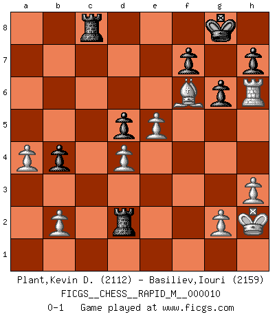 Last move : 0-1 2008 September 13 17:9:22 [Event "FICGS__CHESS__RAPID_M__000010"] [Site "FICGS"] [Date "2008.07.04"] [Round "1"] [White "Plant,Kevin D."] [Black "Basiliev,Iouri"] [Result "0-1"] [WhiteElo "2112"] [BlackElo "2159"] 1.e4 c5 2.Nf3 d6 3.d4 cxd4 4.Bb5+ Bd7 5.Bxd7+ Qxd7 6.Qxd4 Nc6 7.Qd3 g6 8.O-O Bg7 9.Nc3 Nf6 10.Bg5 Ng4 11.Rab1 Rc8 12.Nd5 e6 13.Ne3 Nb4 14.Qd2 Nxe3 15.fxe3 Na6 16.Rbd1 Nc5 17.e5 Ne4 18.Qb4 d5 19.c3 b5 20.Bf6 Rc4 21.Qb3 O-O 22.Nd2 Nxd2 23.Rxd2 Bh6 24.Rf3 Rfc8 25.Rh3 Bf8 26.a3 a5 27.Rf3 b4 28.cxb4 axb4 29.a4 Qc6 30.Rd1 Bh6 31.Rh3 d4 32.Rxh6 Rc1 33.h3 Qd5 34.Qxd5 Rxd1+ 35.Kh2 exd5 36.exd4 Rd2 0-1 Comment by player 1 : Kevin D. Plant : Well played Sicilian Kingside Castling by player White (move 8) Kingside Castling by player Black (move 21) Player Black won this chess game. Follow this game move after move (download)All my games are real. (Bobby Fischer) Wenn ich Weiß habe gewinne ich weil ich Weiß habe, wenn ich Schwarz habe gewinne ich weil ich Bogoljubov bin. (Efim Bogoljubov) Si el ingenio solamente fuese necesario para lucirse, las mujeres serían las mejores jugadoras de Ajedrez del mundo. (Albin) Les échecs, c'est l'imagination. (David Bronstein) Internal peace cannot coexist with external war. (Don Groves)