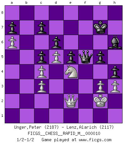 Last move : 1/2-1/2 2008 September 8 10:50:0 [Event "FICGS__CHESS__RAPID_M__000010"] [Site "FICGS"] [Date "2008.07.04"] [Round "1"] [White "Unger,Peter"] [Black "Lenz,Alarich"] [Result "1/2-1/2"] [WhiteElo "2187"] [BlackElo "2117"] 1.d4 Nf6 2.Nf3 g6 3.c4 Bg7 4.Nc3 d6 5.e4 O-O 6.Be2 e5 7.O-O Na6 8.Be3 Ng4 9.Bg5 Qe8 10.d5 f5 11.Ne1 h6 12.Bd2 Nf6 13.f3 g5 14.Na4 fxe4 15.fxe4 Nxe4 16.Rxf8+ Qxf8 17.Be3 Bd7 18.Nd3 Qf5 19.Nc3 Nxc3 20.bxc3 Qe4 21.Qd2 Qg6 22.Nf2 b6 23.Bd3 Bf5 24.Bxf5 Qxf5 25.a4 Nc5 26.Bxc5 bxc5 27.Qe2 Rf8 28.h3 h5 29.Rf1 Qg6 30.a5 Bh6 31.g3 Kg7 32.a6 h4 33.Ne4 Rxf1+ 34.Kxf1 Qf5+ 35.Kg2 1/2-1/2 King's Indian : East Indian defense Kingside Castling by player Black (move 5) Kingside Castling by player White (move 7) This chess game ended in a draw. Follow this game move after move (download)One of these modest little moves may be more embarrassing to your opponent than the biggest threat. (Siegbert Tarrasch) Modernes Schach erfordert enorme Anspannung. Es ist für einen normalen Menschen unmöglich das auszuhalten. (Viktor Kortschnoi) La táctica fluye a partir de una posición superior. (Bobby Fischer) À la honte des hommes, on sait que les lois du jeu sont les seules qui soient partout justes, claires, inviolables et exécutées. Pourquoi l'Indien qui a donné les règles du jeu d'échecs est-il obéi de bon gré dans toute la terre, et que les décrétales des papes, par exemple, sont aujourd'hui un objet d'horreur et de mépris ? C'est que l'inventeur des échecs combina tout avec justesse pour la satisfaction des joueurs, et que les papes, dans leurs décrétales, n'eurent en vue que leur seul avantage. L'Indien voulut exercer également l'esprit des hommes et leur donner du plaisir; les papes ont voulu abrutir l'esprit des hommes. Voltaire (Dictionnaire philosophique / Garnier 1967) Drag your thoughts away from your troubles... by the ears, by the heels, or any other way you can manage it. (Mark Twain)