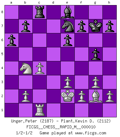Last move : 1/2-1/2 2008 July 14 20:28:31 [Event "FICGS__CHESS__RAPID_M__000010"] [Site "FICGS"] [Date "2008.07.04"] [Round "1"] [White "Unger,Peter"] [Black "Plant,Kevin D."] [Result "1/2-1/2"] [WhiteElo "2187"] [BlackElo "2112"] 1.d4 Nf6 2.Nf3 d5 3.c4 e6 4.g3 dxc4 5.Bg2 c5 6.O-O Nc6 7.Ne5 Bd7 8.Na3 cxd4 9.Naxc4 Bc5 10.Qb3 Nxe5 11.Nxe5 O-O 12.Bf4 Bc8 13.Qc4 Bb6 14.Nd3 Nd5 15.Be5 Bd7 16.Bxd4 Rc8 17.Bxb6 Qxb6 18.Qb3 Qxb3 19.axb3 a6 20.Rfd1 Bc6 21.e3 Ne7 22.Nb4 Rc7 23.Rac1 Rfc8 24.Rc4 Be8 25.Rdc1 Rxc4 26.bxc4 g5 27.Kf1 Kg7 28.Ke2 1/2-1/2 Queen's pawn game Kingside Castling by player White (move 6) Kingside Castling by player Black (move 11) This chess game ended in a draw. Follow this game move after move (download)Fischer was a master of clarity and a king of artful positioning. His opponents would see where he was going but were powerless to stop him. (Bruce Pandolfini) Ein Buch ist ein Spiegel; wenn ein Affe hineinsieht, so kann kein Apostel heraus gucken. (Georg Christoph Lichtenberg) Hay jugadores fuertes y personas amables y yo soy un jugador fuerte. (Bobby Fischer) Vous savez, camarade Pachman, je n'éprouve pas de plaisir à être ministre, je jouerais plutôt aux échecs comme vous, ou alors ferais une révolution au Venezuela. (Che Guevara à Ludek Pachman, 'Checkmate in Prague', 1975) To send light into the darkness of men's hearts - such is the duty of the artist. (Schumann)