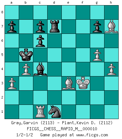 Last move : 1/2-1/2 2008 September 17 9:31:16 [Event "FICGS__CHESS__RAPID_M__000010"] [Site "FICGS"] [Date "2008.07.04"] [Round "1"] [White "Gray,Garvin"] [Black "Plant,Kevin D."] [Result "1/2-1/2"] [WhiteElo "2113"] [BlackElo "2112"] 1.c4 e5 2.Nc3 Nc6 3.Nf3 Nf6 4.a3 d5 5.d4 exd4 6.Nxd4 dxc4 7.Nxc6 Qxd1+ 8.Nxd1 bxc6 9.Bf4 Nd5 10.Bd2 Be6 11.e4 Nb6 12.Rc1 O-O-O 13.Ne3 Bc5 14.f3 Rd7 15.b4 Bxe3 16.Bxe3 Kb7 17.Be2 Ka6 18.g4 f6 19.h4 Kb5 20.g5 Na4 21.Rc2 Rf8 22.Kf2 f5 23.Rhc1 fxe4 24.Rxc4 Rxf3+ 25.Bxf3 Bxc4 26.Bxe4 Nb2 27.Bxh7 Nd1+ 28.Kf3 1/2-1/2 English : Four knights, Marini variation Queenside Castling by player Black (move 12) This chess game ended in a draw. Follow this game move after move (download)Chess is 99 percent tactics. (Teichmann) Es war undenkbar für die Behörden, dass ein sowjetischer Großmeister auf diese Art und Weise [Fischer-Taimanov 6:0] verliert, ohne dass es eine politischer Erklärung dafür gäbe. (Mark Taimanov) Yo siempre he tenido un ligero sentimiento de lástima por una persona que no tiene conocimiento del Ajedrez. (Siegbert Tarrasch) Avec des compensations pour le matériel en plus... (Anonyme) I don't know, I don't care, and it doesn't make any difference. (Albert Einstein)